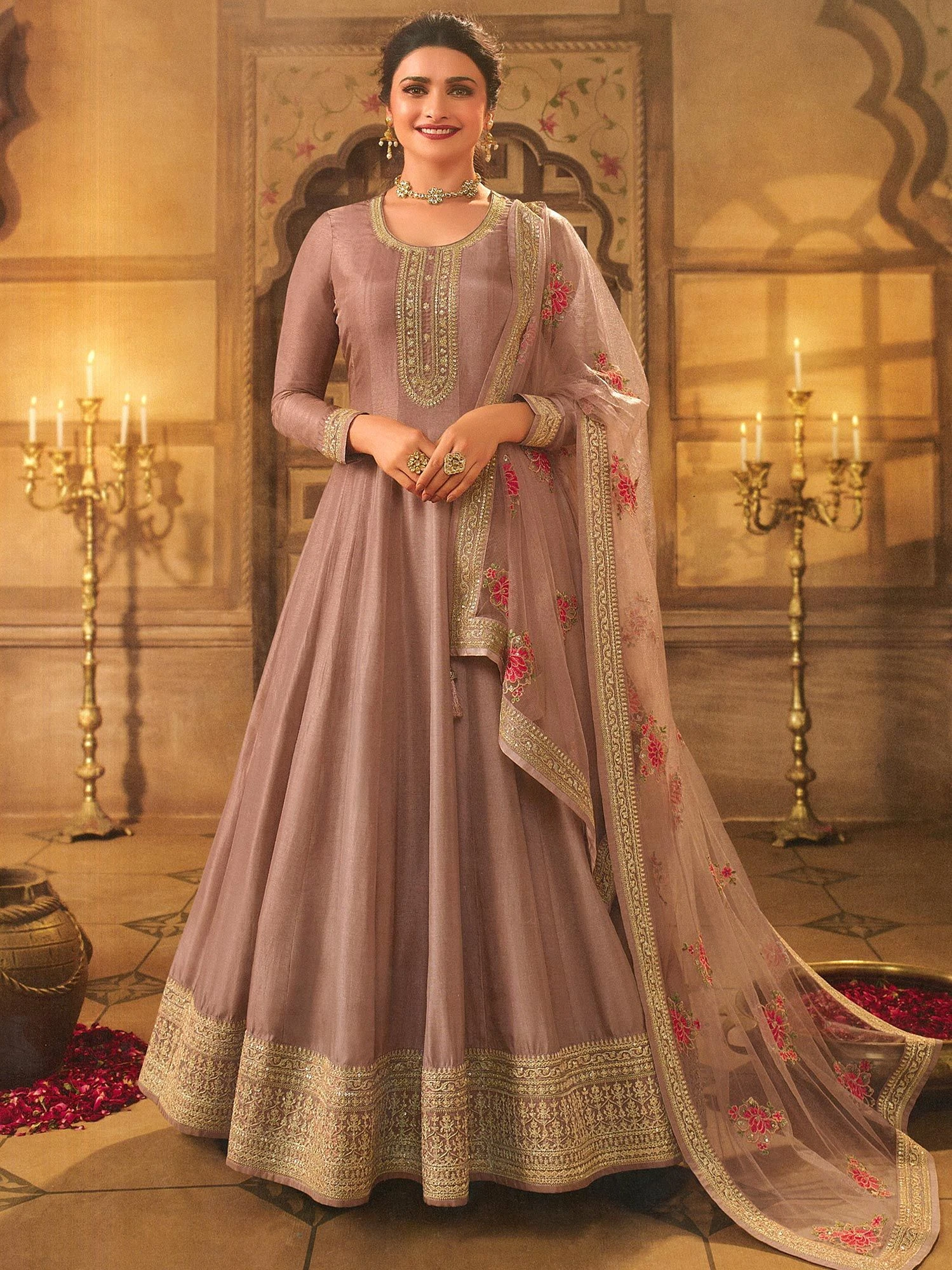 Lighten up the world as you wear this light brown color anarkali kameez in art silk. Furnished using sequins, thread work and zari work embroidery all over. Paired with a brown embroidered dupatta in net and a matching bottom in shantoon. Note: Accessories shown are for styling purpose only. Slight color variation may occur due to photographic reasons. The semi-stitched kameez can be customised upto 42 inches.