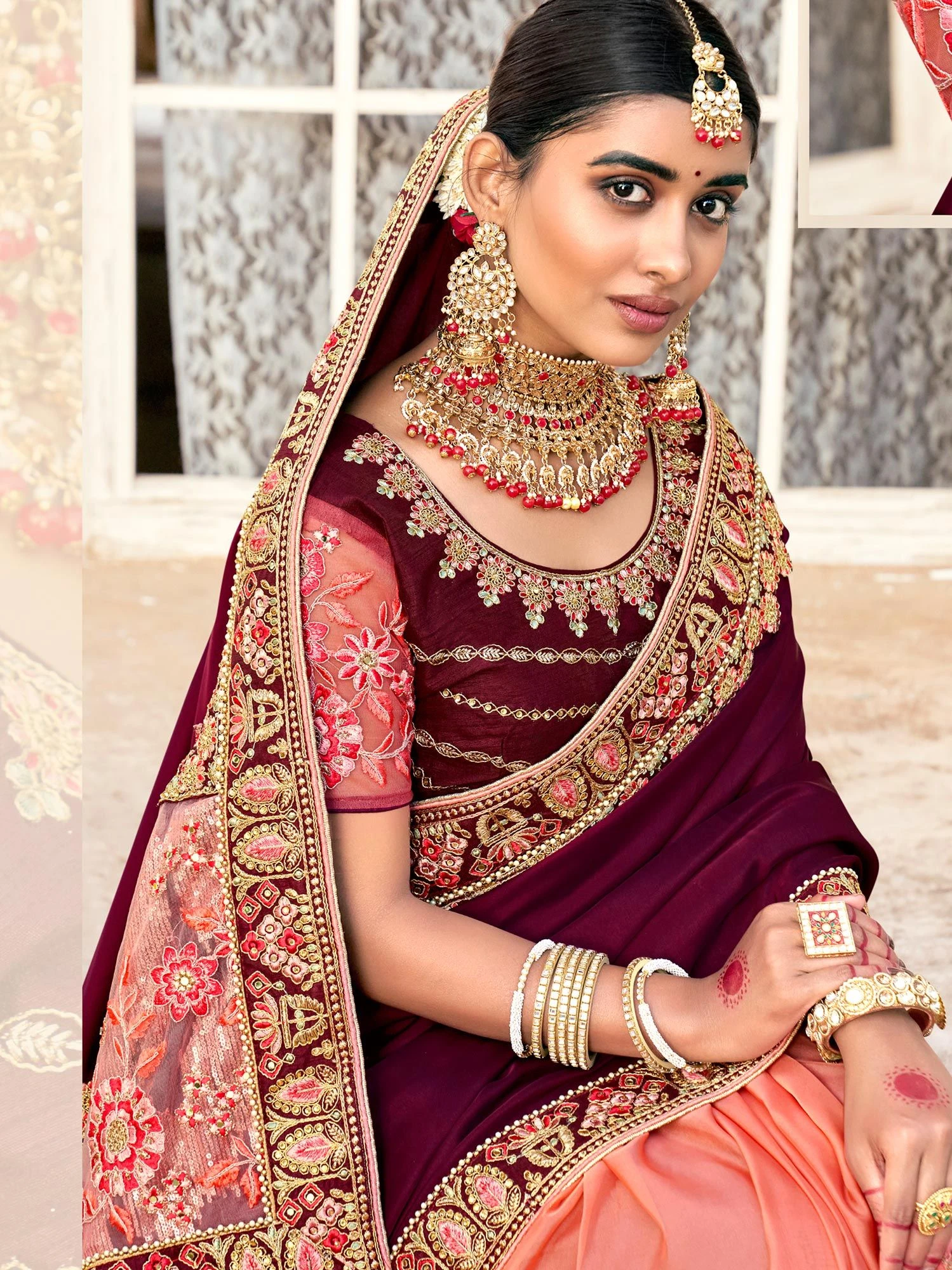 Give a glamorous glance wearing this deep purple and peach half and half saree crafted in art silk. Designed using thread, stone, zari embroidery with stones embellishments showcasing distinstive borders. Available with a matching purple color blouse in art silk. Note: The accessories featured are purely for fashion purposes. Due to photography reasons, some color variations may occur. The un-stitched blouse may be customized up to 42 inches.