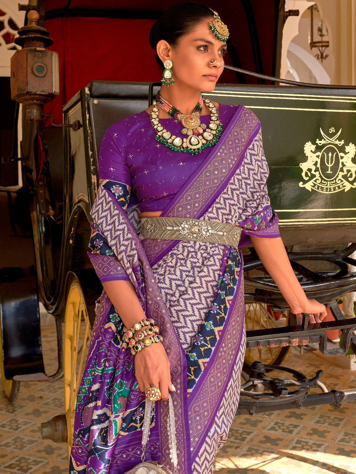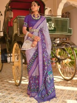 Captivate hearts wearing this purple and white color saree crafted in patola silk. Enhanced using patola prints, stones, zari woven distinstive borders and pallu. Comes with a matching heart purple color blouse in silk. Note: The accessories featured are purely for fashion purposes. Due to photography reasons, some color variations may occur. The un-stitched blouse may be customized up to 42 inches.