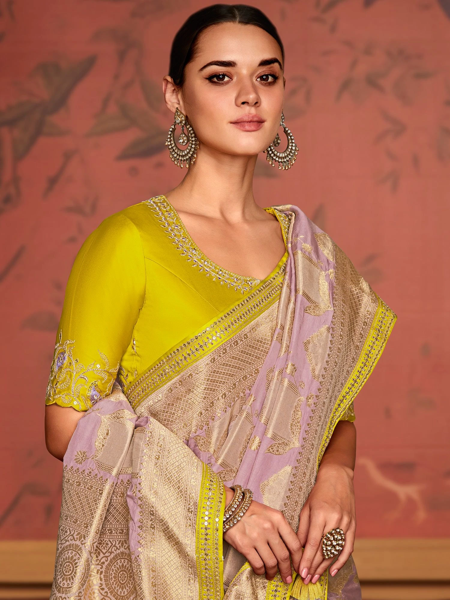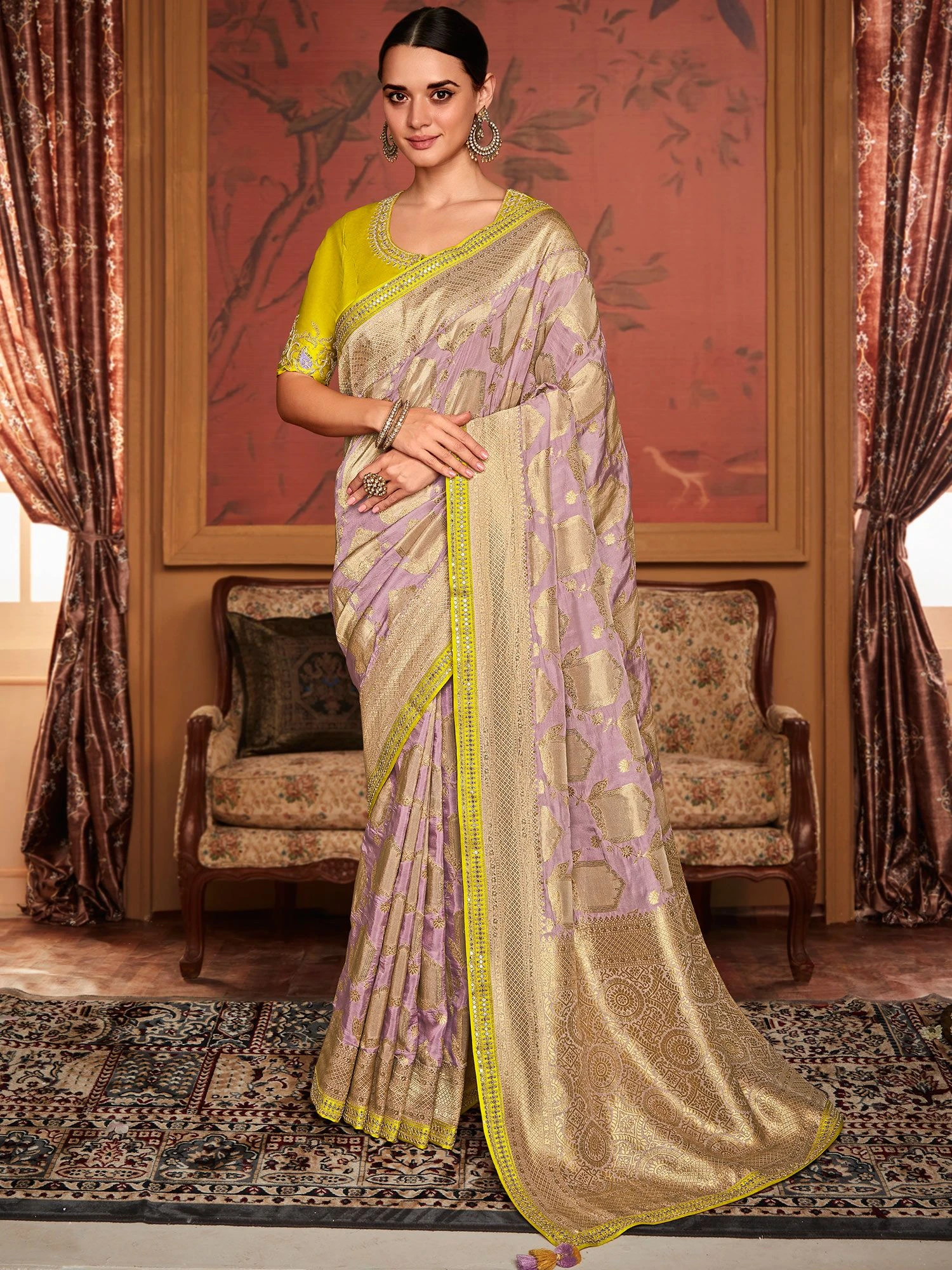 Elevate your style to ethereal heights wearing this lavender purple color saree made in silk. Decorated using zari woven patterns, showcasing distinstive borders and pallu. Teamed with a matching lemon yellow color embroidered blouse in silk. Note: The accessories featured are purely for fashion purposes. Due to photography reasons, some color variations may occur. The un-stitched blouse may be customized up to 42 inches.