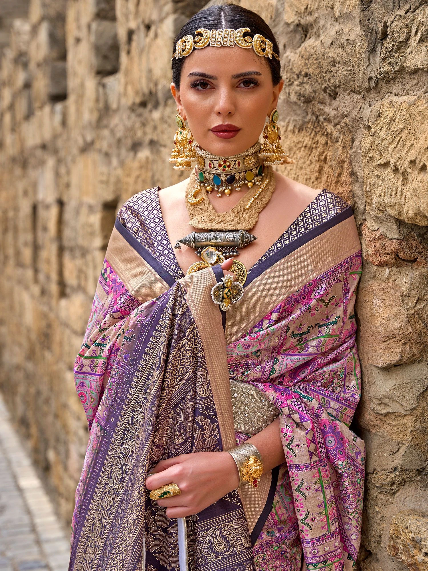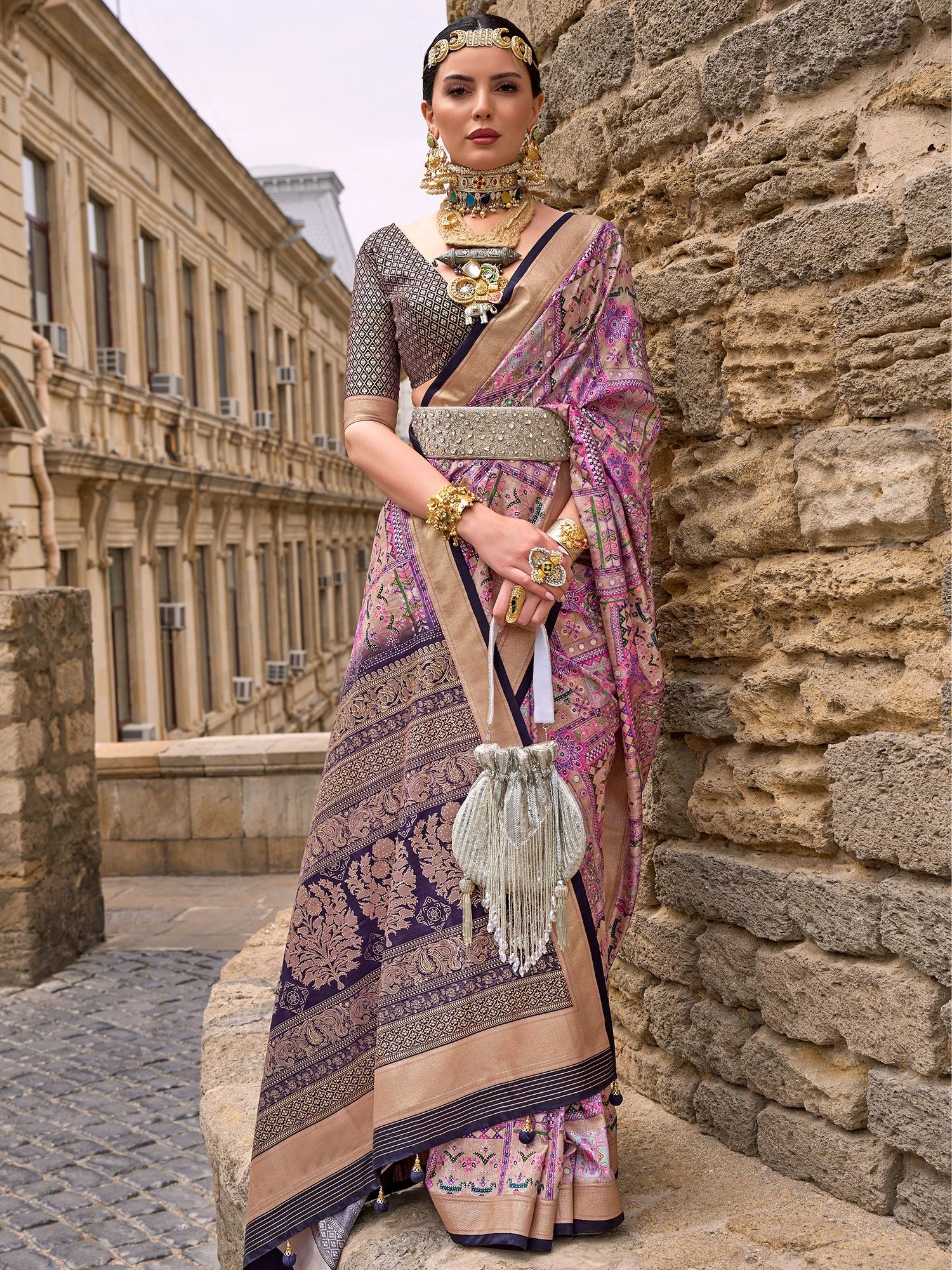 Makes it a versatile choice of every celebration wearing this pink purple color saree crafted in silk. Enhanced using woven and printed patterns, showcasing distinstive borders and pallu. Comes with a matching blue color blouse in silk. Note: The accessories featured are purely for fashion purposes. Due to photography reasons, some color variations may occur. The un-stitched blouse may be customized up to 42 inches.