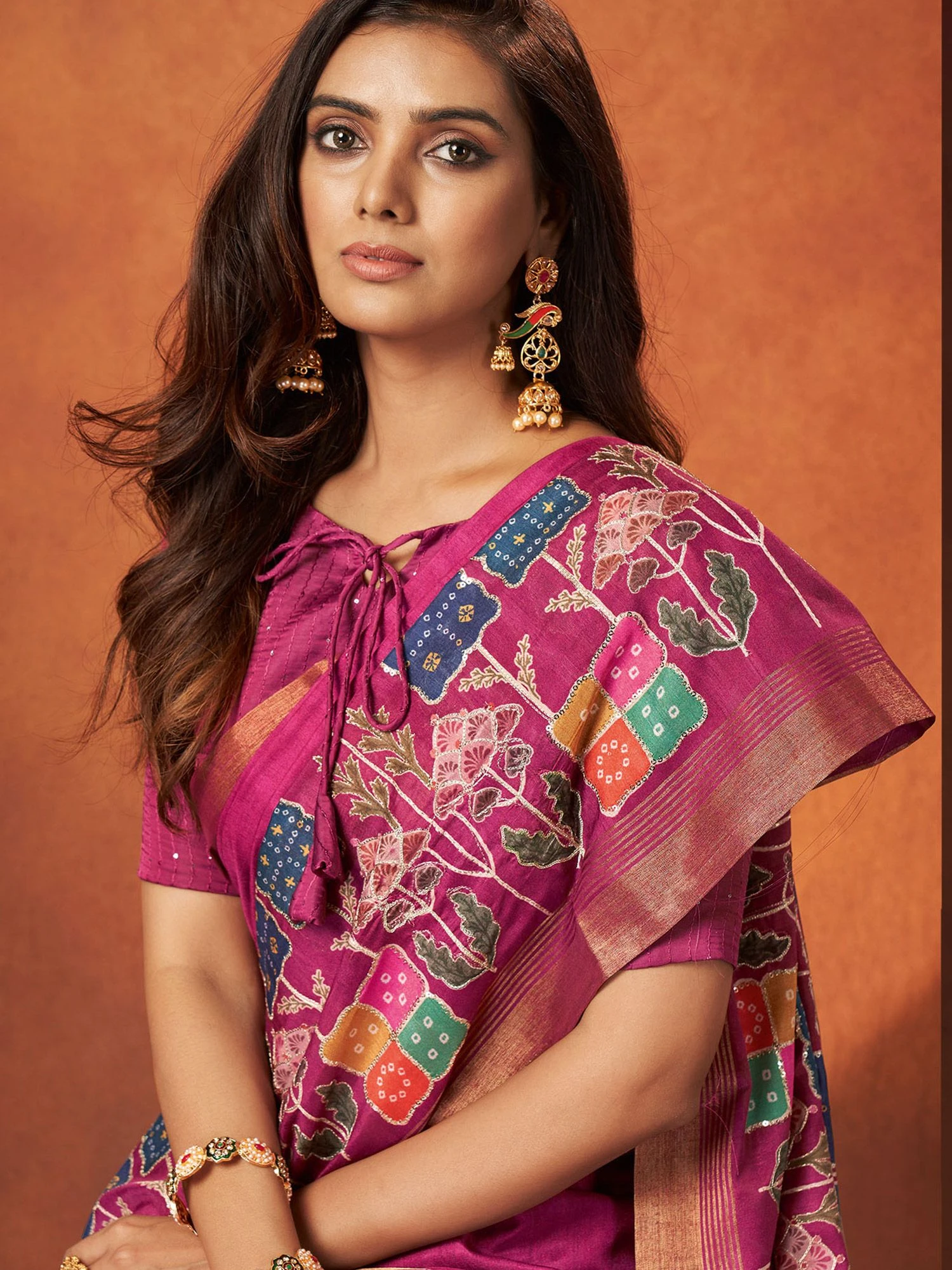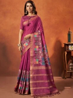 Steal the limelight adorning this magenta color saree fabricated in crepe silk. Crafted using printed patterns, showcasing distinstive borders and pallu. Comes with a matching magenta color blouse in spun satin. Note: The accessories featured are purely for fashion purposes. Due to photography reasons, some color variations may occur. The un-stitched blouse may be customized up to 42 inches.