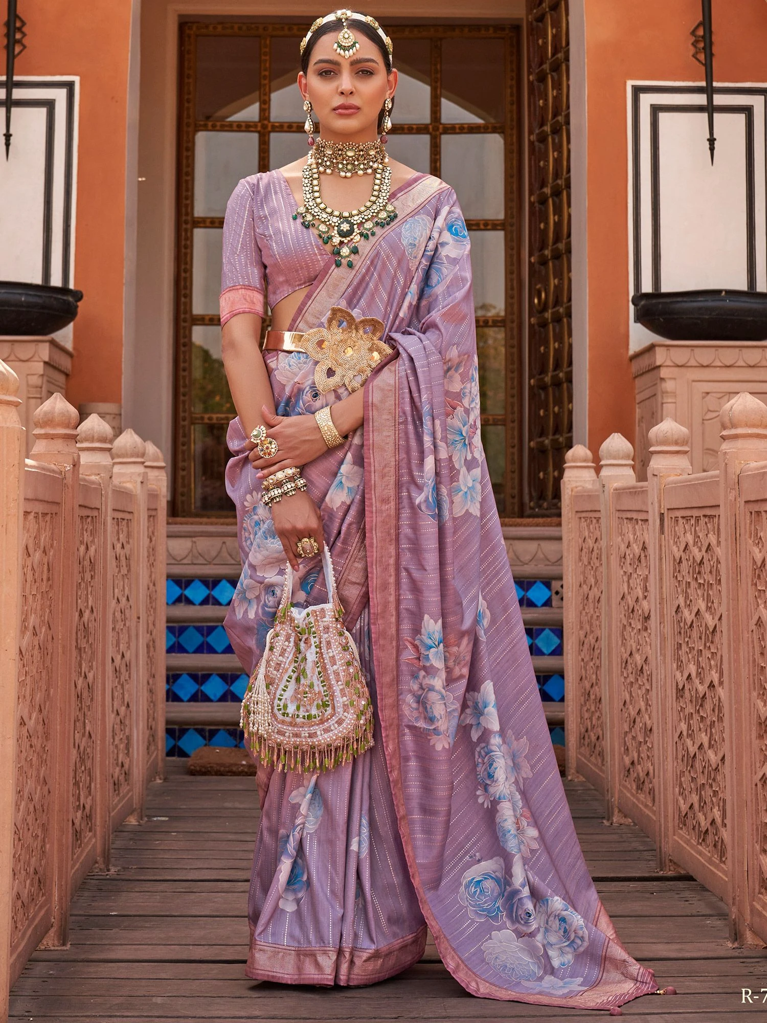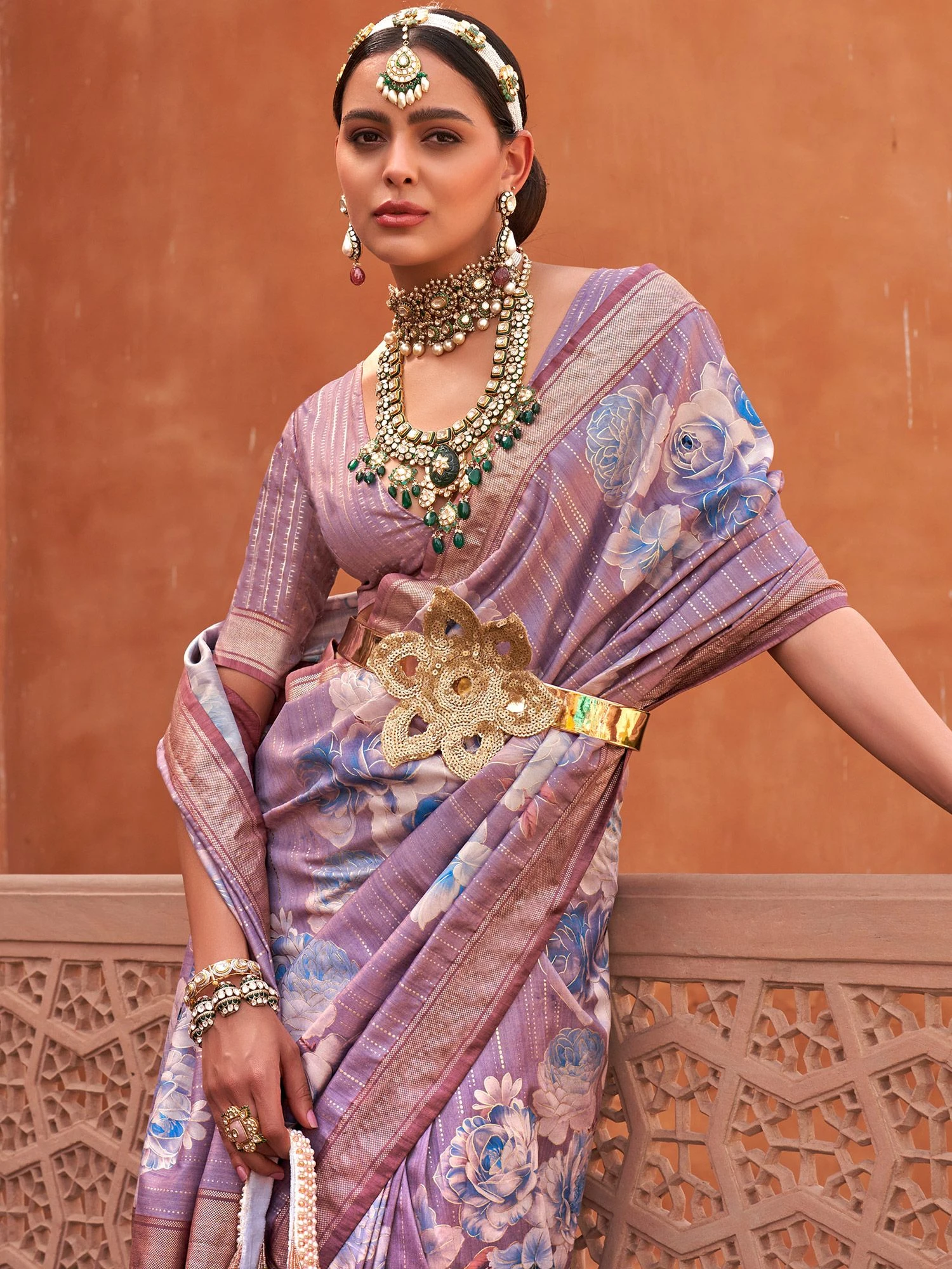 Spread the essence of grace and femininity wearing this heather purple color saree crafted in silk. Augmented using floral printed patterns, showcasing distinstive borders and pallu. Paired with a matching purple color blouse in silk. Note: The accessories featured are purely for fashion purposes. Due to photography reasons, some color variations may occur. The un-stitched blouse may be customized up to 42 inches.