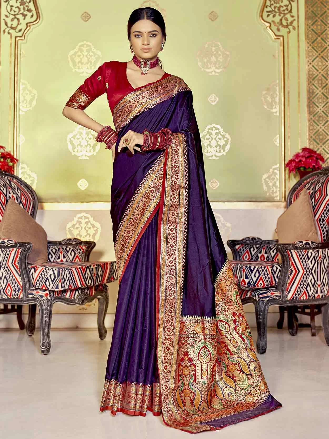 Unique magnificence can come out out of your dressing design with this Purple Colour Banarasi Silk Fabric Saree. The ethnic Zari,Weaving Work work at the clothing adds a sign of attractiveness statement with your look.