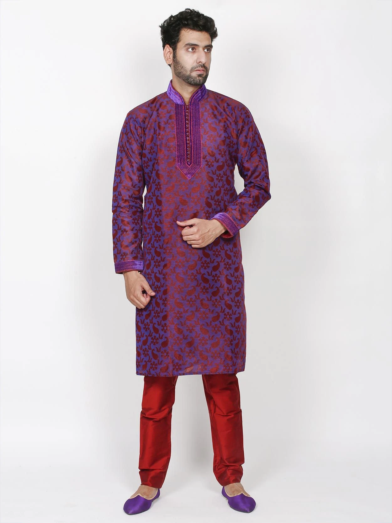 Look vibrant in this Purple Colour Brocade Fabric Readymade Kurta Pajama With Printed,Thread Work. Garment features elaborate Readymade Kurta decorated with different patterns.