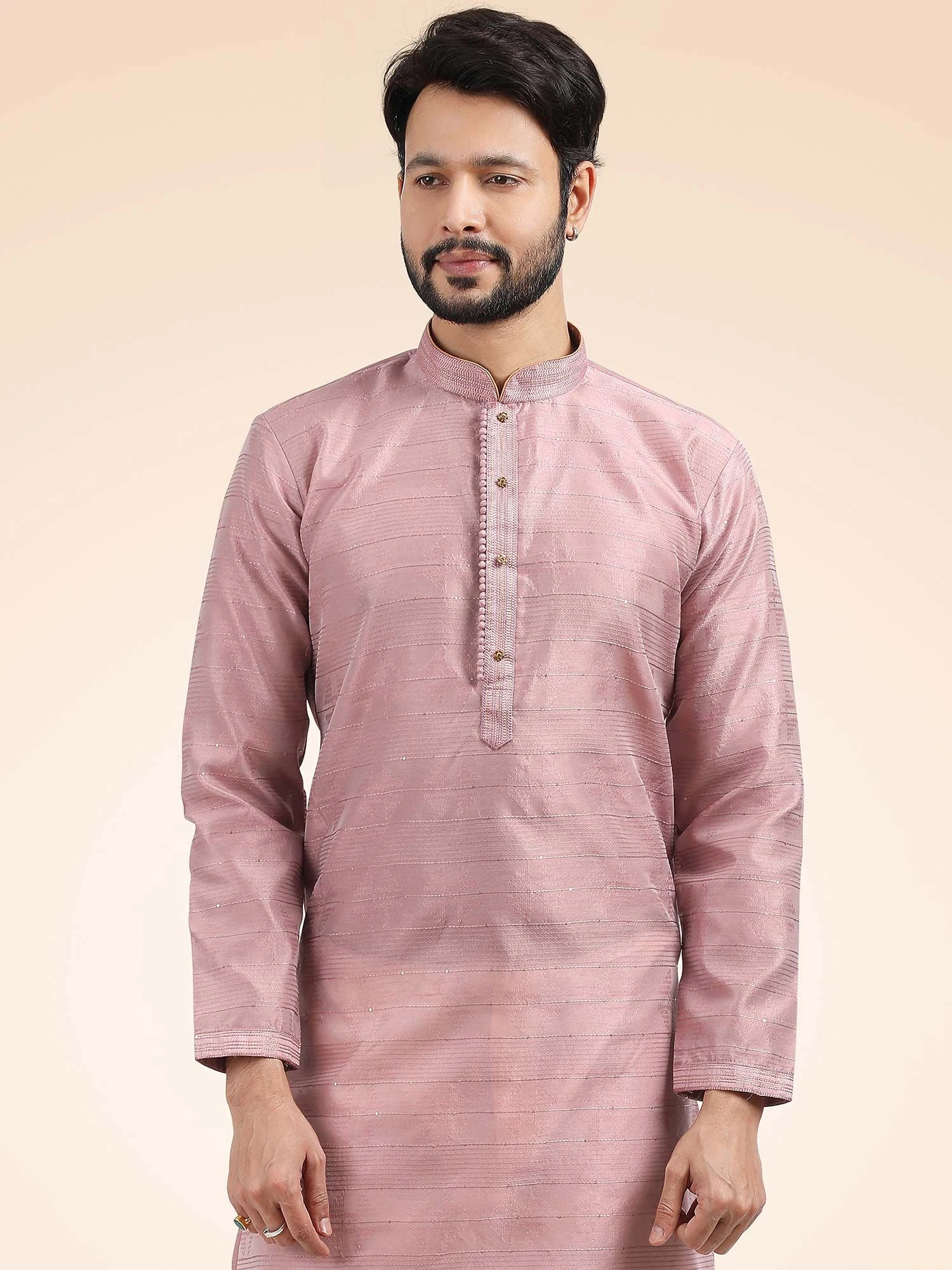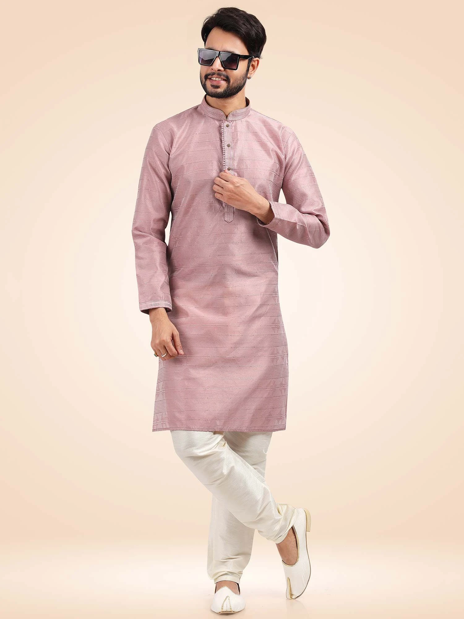 Grab all the compliments adorning this lavender purple color men’s kurta made in banarasi silk. Furnished using sequins and thread embroidery details all over. Comes with matching white color churidar pants in art silk. Note: Some color variations may occur owing to photography causes. Up to 1 inch of measurement fluctuation is possible.