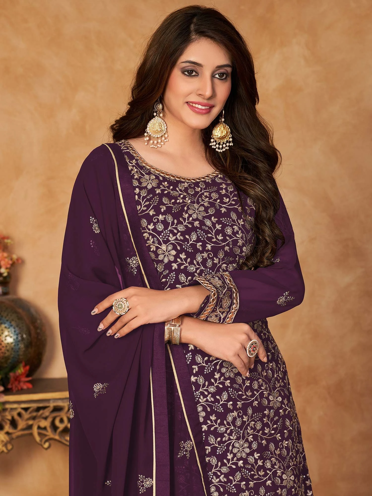 Look no less than a dream adorning this purple color kameez in georgette. Crafted using zari, sequins and thread work embroidery all over. Paired with a matching georgette dupatta and a matching sharara in shantoon. Note: Accessories shown are for styling purpose only. Slight color variation may occur due to photographic reasons. The semi-stitched kameez can be customised upto 42 inches.