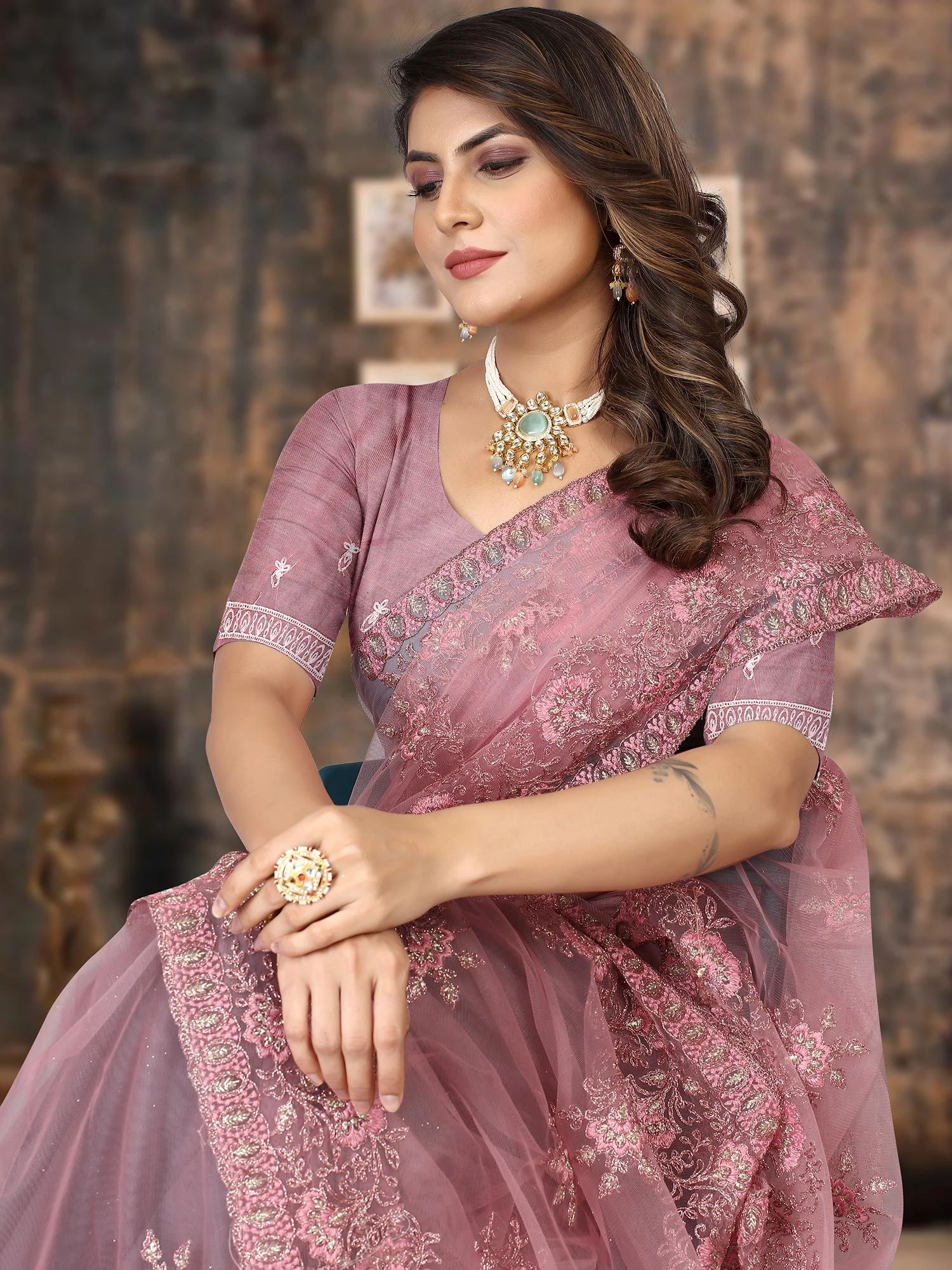 Step into the spotlight adorning this mauve purple color sari in net. Enhanced using zari and thread embroidered patterns, showcasing distinstive borders and pallu. Assembled with a matching purple color embroidered blouse in net. Note: The accessories featured are purely for fashion purposes. Due to photography reasons, some color variations may occur. The un-stitched blouse may be customized up to 42 inches.