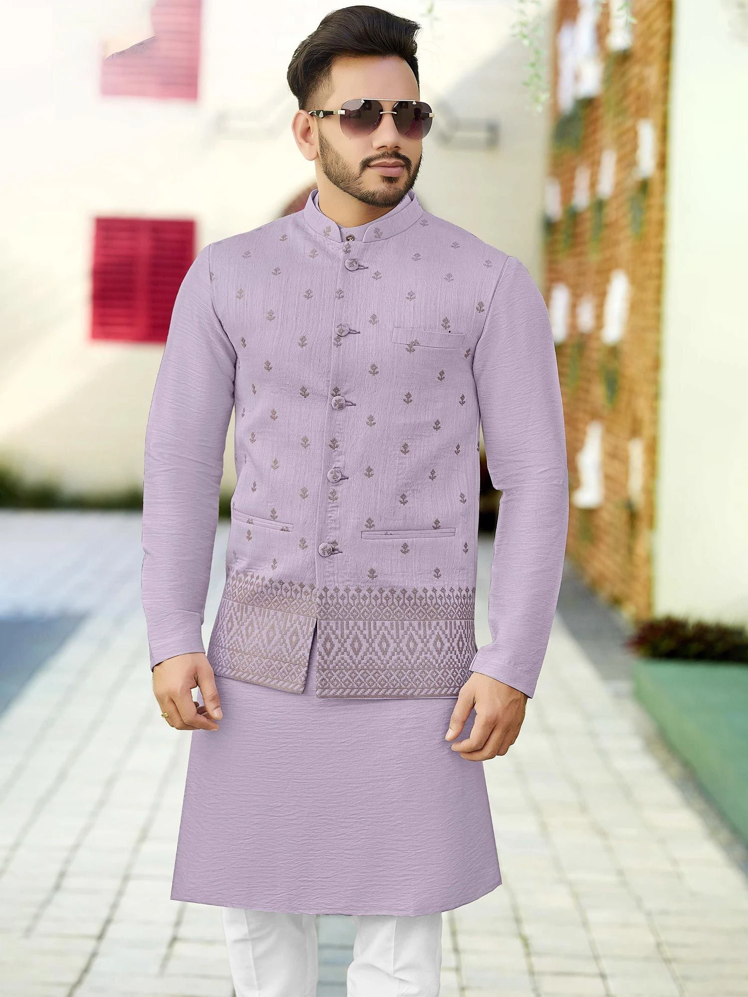 Illuminate your surroundingd adorning this purple color kurta made in jacquard. Topped with a purple printed nehru jacket made in jacquard. Paired with a white color trouser pants in cotton. Note: Some color variations may occur owing to photography causes. Up to 1 inch of measurement fluctuation is possible.