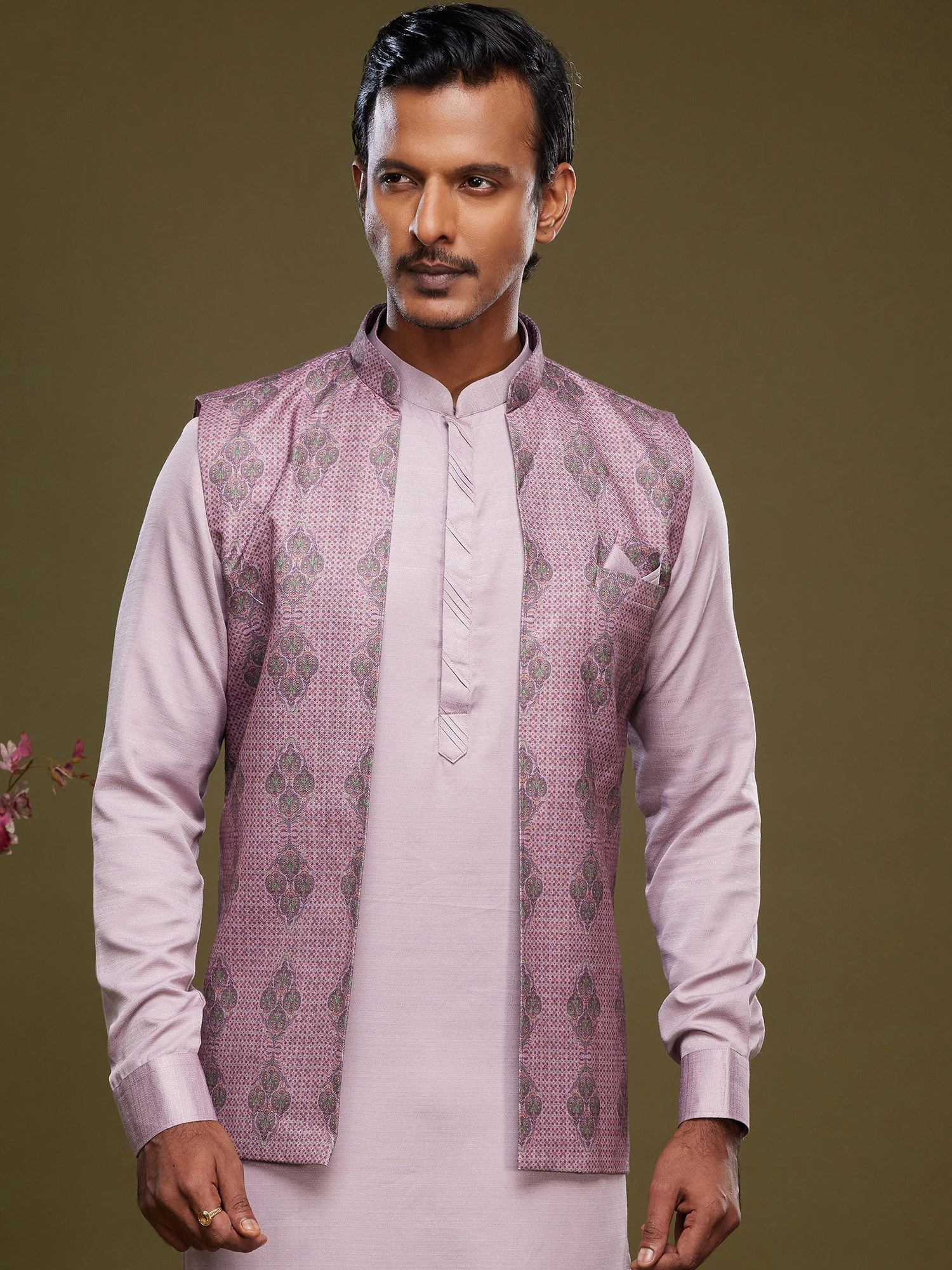 Step into the spotlight with this light purple color kurta made in banarasi art silk. Topped with a long printed purple jacket in satin. Augmented with madarin collar, placket and bottoned sleeves. Comes with a purple color straight pajama in art silk. Note: Some color variations may occur owing to photography causes. Up to 1 inch of measurement fluctuation is possible.