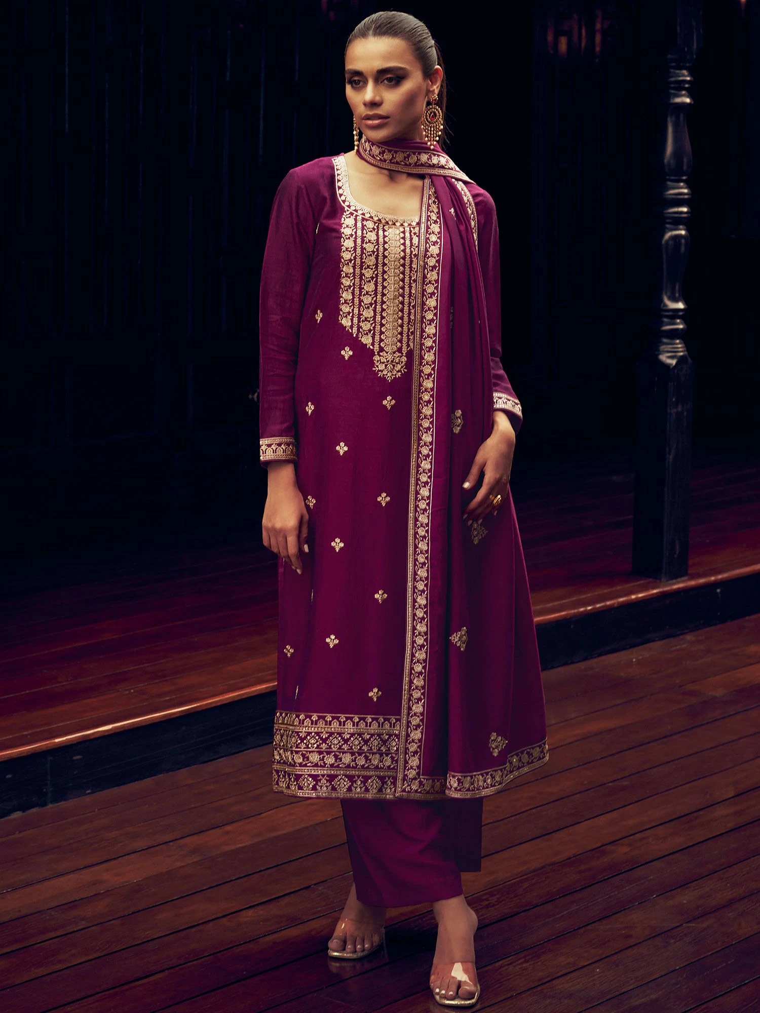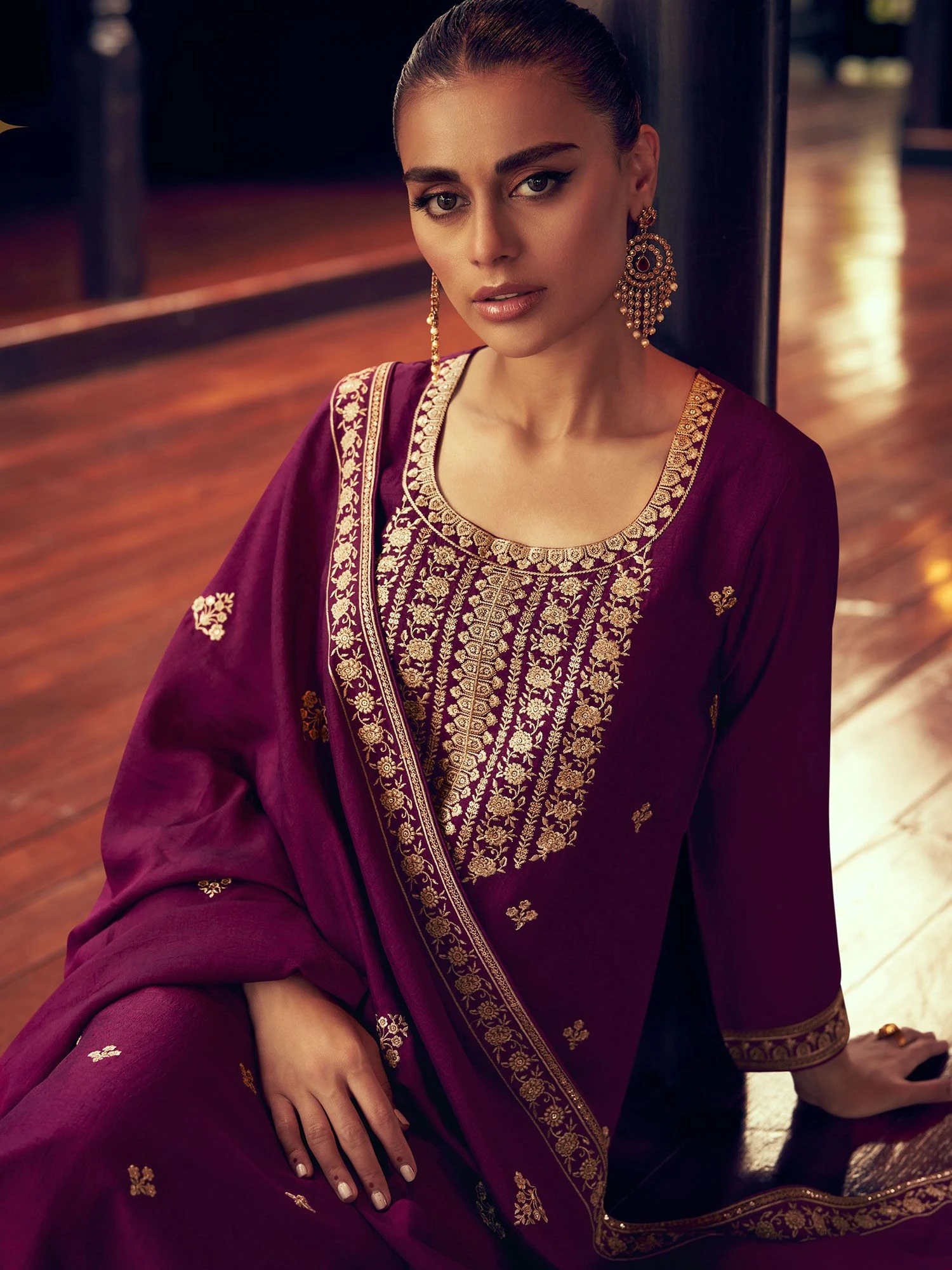 Enhance yourself with this jam purple color straight cut kameez in silk. Crafted using sequins and thread work embroidery all over. Teamed with a silk dupatta and a palazzo style bottom, both made in purple color. Note: Accessories shown are for styling purpose only. Slight color variation may occur due to photographic reasons. The semi-stitched kameez can be customised upto 42 inches.