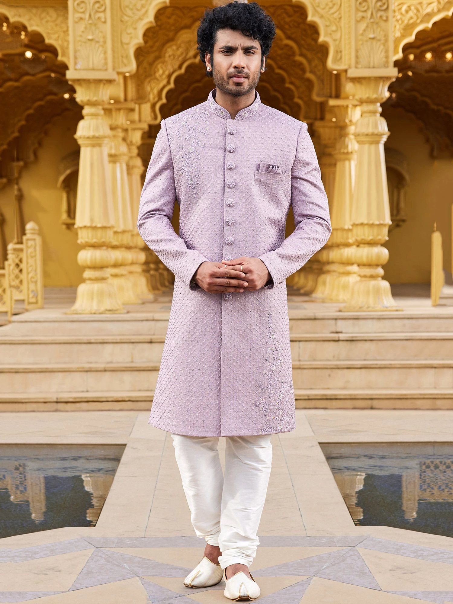 Casting a magical aura with every move with this white color sherwani made in silk. Augmented using sequin, stone work and woven embroidered details all over. Assembled with white color churidaar in silk. Note: Some color variations may occur owing to photography causes. Up to 1 inch of measurement fluctuation is possible.