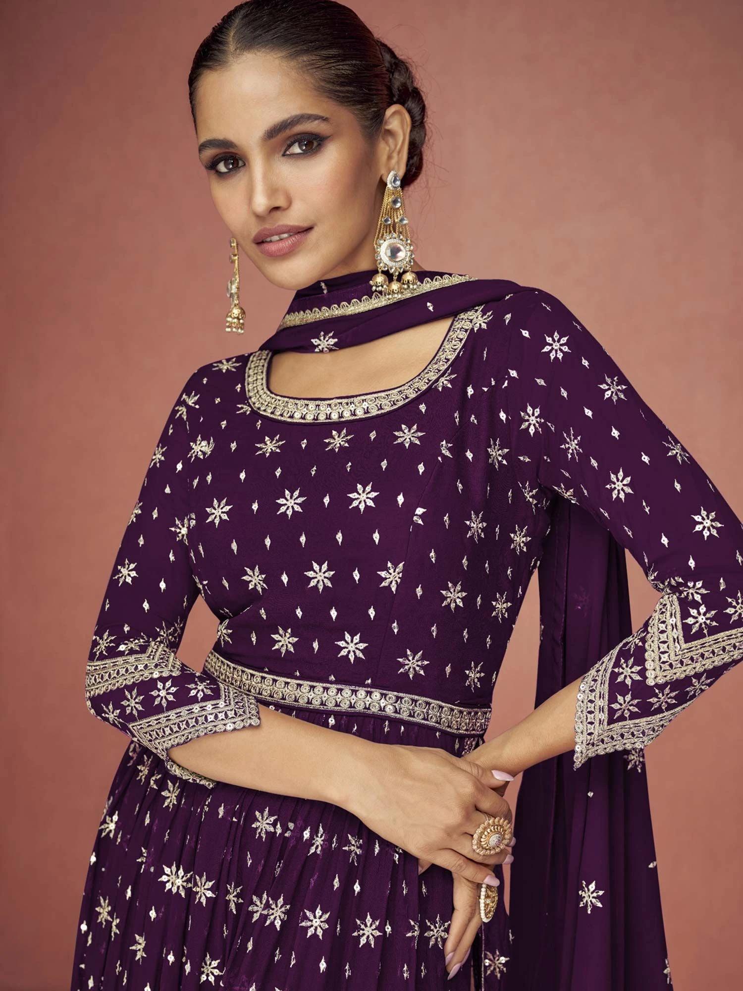 Win the hearts adorning this purple color gathered kameez in georgette. Augmented using sequins and thread work embroidery all over. Comes with a matching dupatta and a matching palazzo in georgette. Note: Accessories shown are for styling purpose only. Slight color variation may occur due to photographic reasons. The semi-stitched kameez can be customised upto 42 inches.