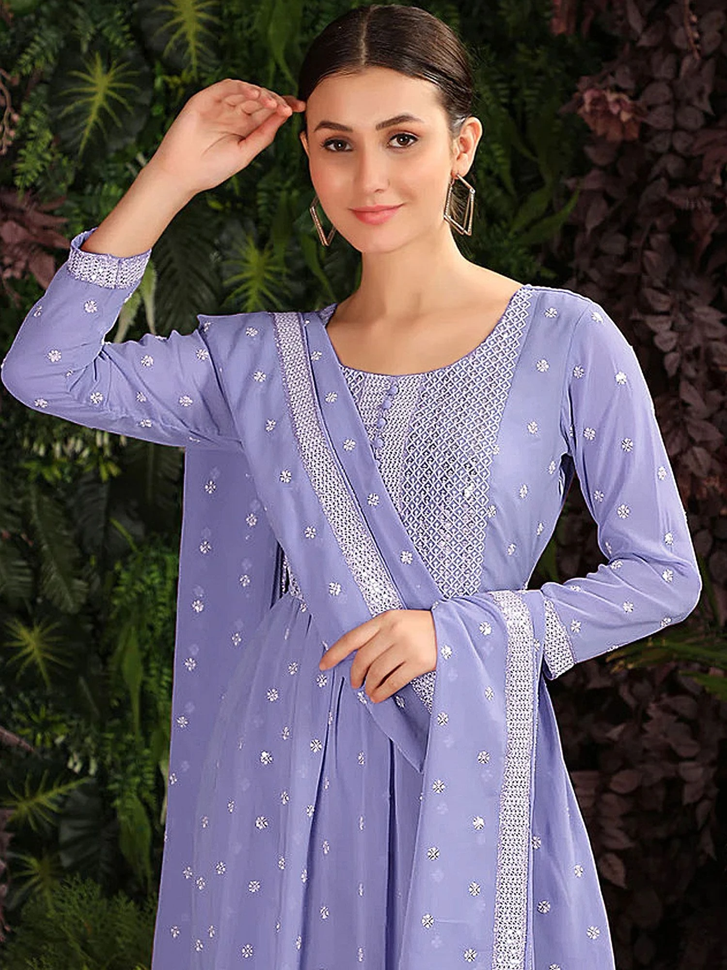 Cherish Your look with this midnight Purple color straight cut kameez in georgette. Augmented using sequins and thread work embroidery all over. Assigned with a georgette dupatta and a sharara style bottom, both made in midnight purple. Note: Accessories shown are for styling purpose only. Slight color variation may occur due to photographic reasons. The semi-stitched kameez can be customised upto 42 inches.