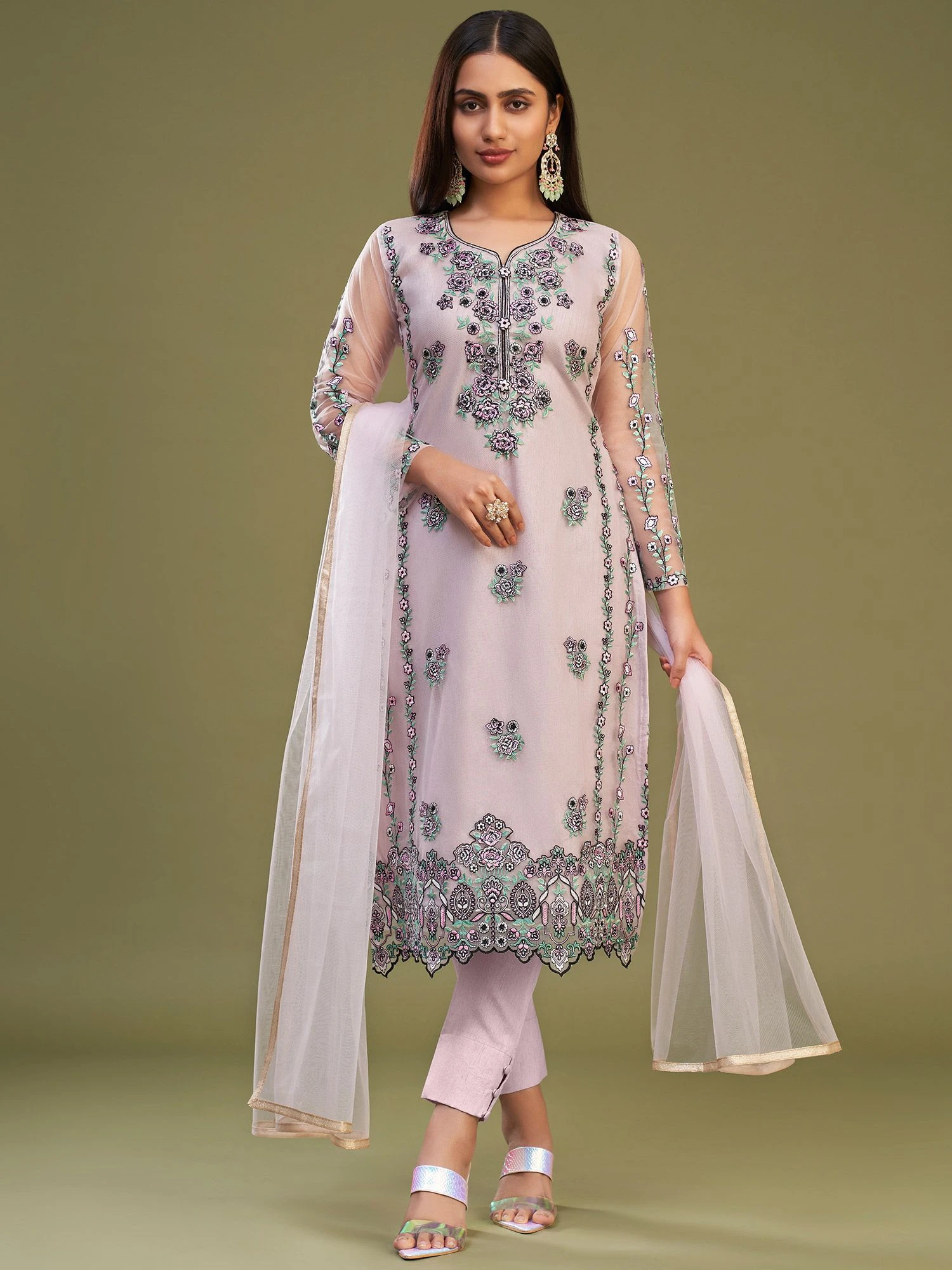 Enhance yourself with this periwinkle purple color straight cut kameez in net. Crafted using thread work and floral embroidery all over. Teamed with a net dupatta and a pant style bottom in banglory silk, both made in purple color. Note: Accessories shown are for styling purpose only. Slight color variation may occur due to photographic reasons. The semi-stitched kameez can be customised upto 42 inches.