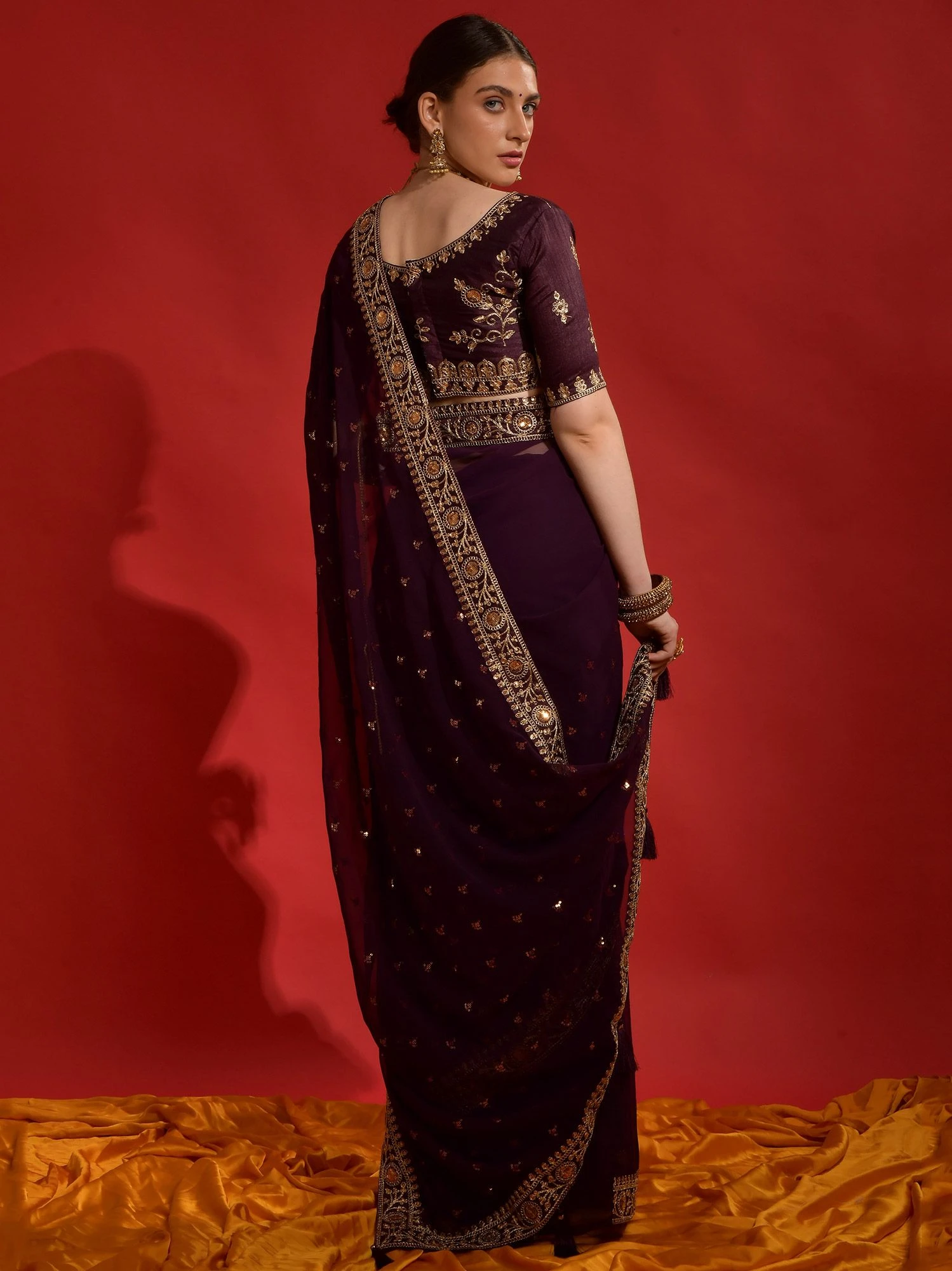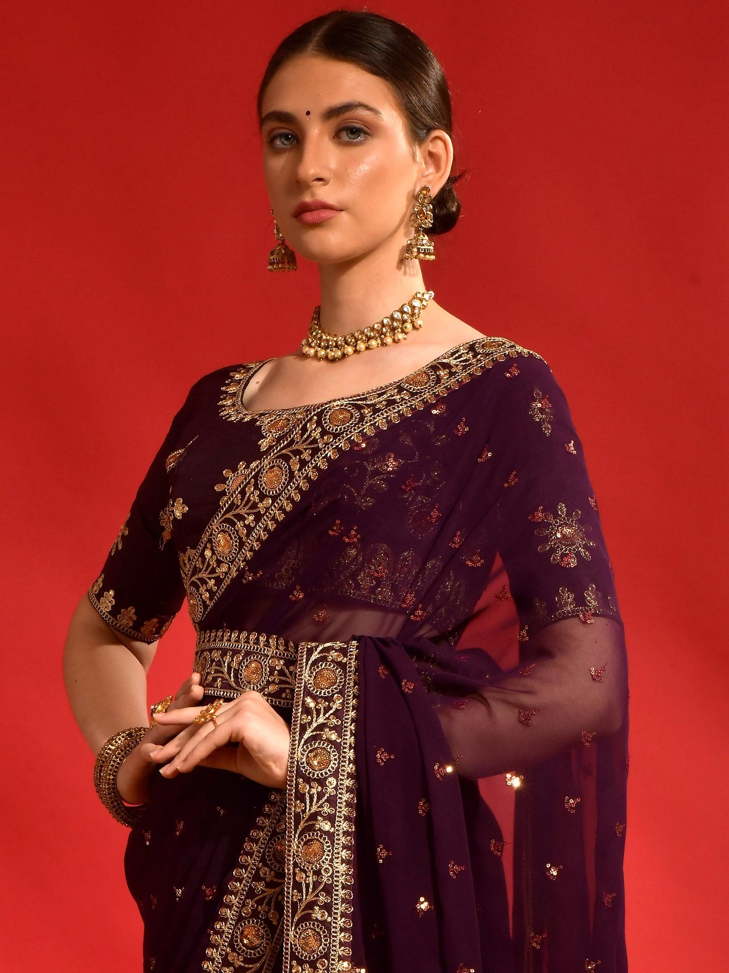 Get all the celebration vibes wearing this wine purple color saree crafted in georgette. Elevated using zari and sequins embroidered patterns, showcasing distinstive borders. Assembled with a matching purple color embroidered blouse in georgette. Note: The accessories featured are purely for fashion purposes. Due to photography reasons, some color variations may occur. The un-stitched blouse may be customized up to 42 inches.