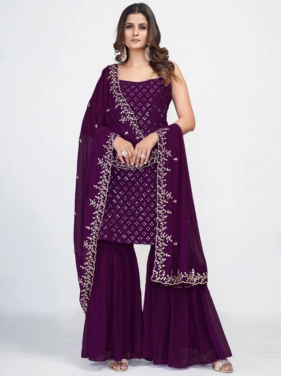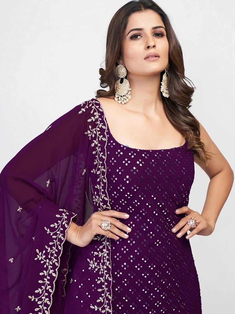 Exude major dreamy vibes with this wine purple color straight cut kameez in georgette. Designed using mirror work and zari embroidery all over. Paired with a georgette dupatta and a sharara style bottom, both made in wine purple color. Note: Accessories shown are for styling purpose only. Slight color variation may occur due to photographic reasons. The semi-stitched kameez can be customised upto 42 inches.