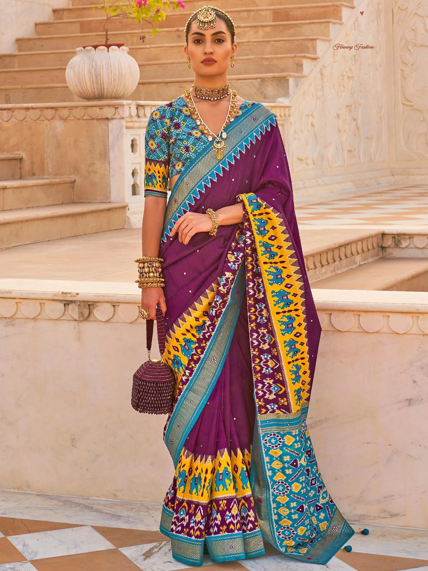 Elevate your festive look adorning this grape purple color saree crafted in silk. Enriched using patola printed patterns and mirror work, showcasing distinstive borders and pallu. Assembled with a matching patola printed blue color blouse in silk. Note: The accessories featured are purely for fashion purposes. Due to photography reasons, some color variations may occur. The un-stitched blouse may be customized up to 42 inches.