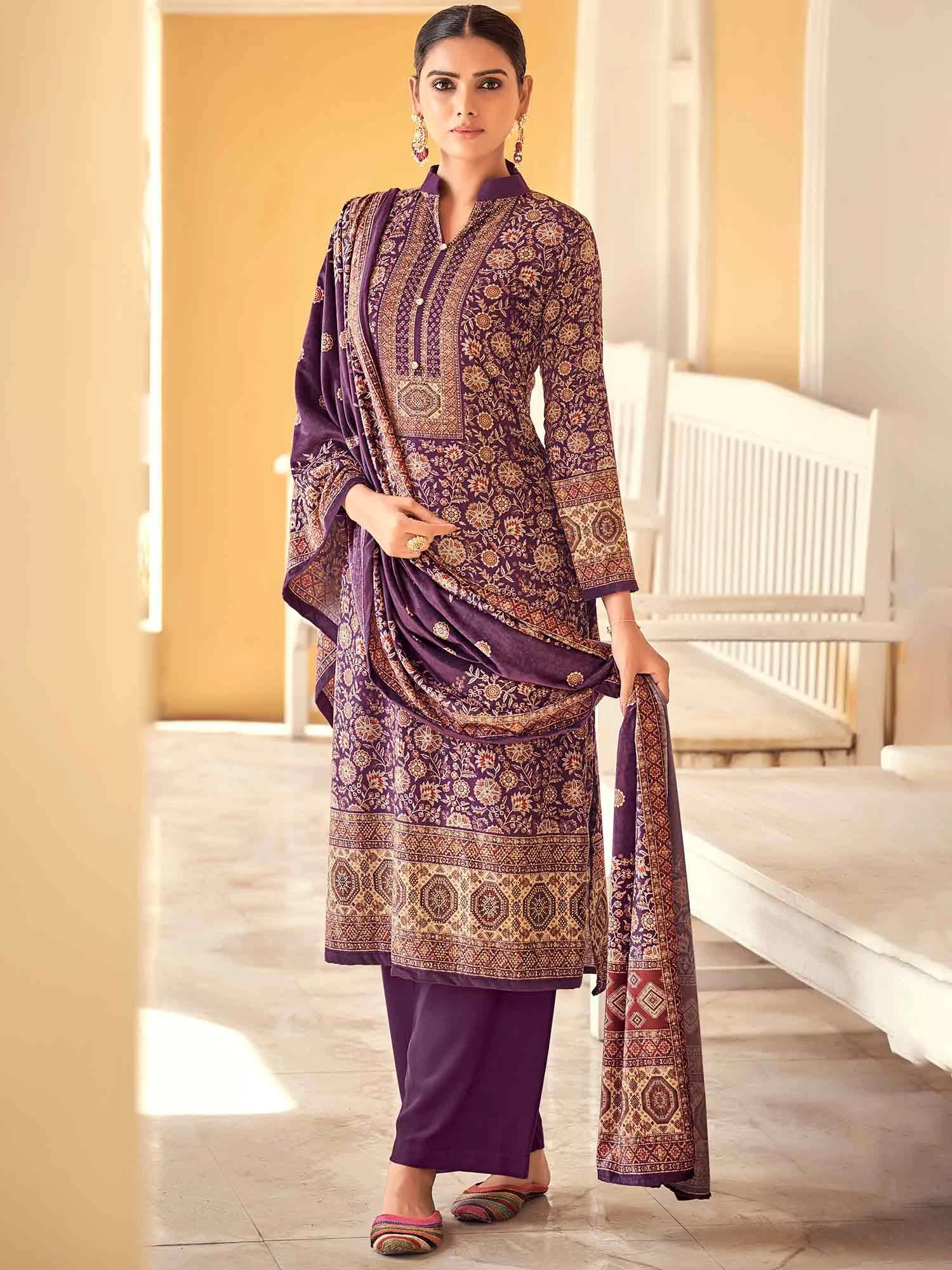 Evoke a classy diva in you adorning this purple color straight cut kameez in velvet. Crafted with floral digital prints all over and stones work. Paired with a matching printed pashmina dupatta and velvet pants. Note: Accessories shown are for styling purpose only. Slight color variation may occur due to photographic reasons. The semi-stitched kameez can be customised upto 42 inches.