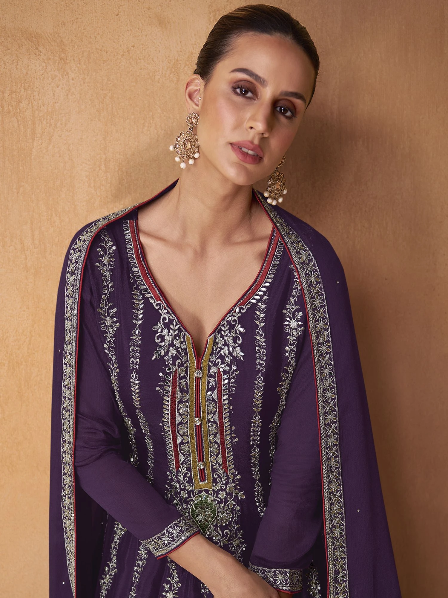 Glam up the views with this midnight purple color anarkali style kameez in chinon silk. Enhanced using sequins, stone with zari work embroidery all over. Assigned with a chinon silk dupatta and a palazzo style bottom, both made in midnight purple color. Note: Accessories shown are for styling purpose only. Slight color variation may occur due to photographic reasons. The semi-stitched kameez can be customised upto 42 inches.