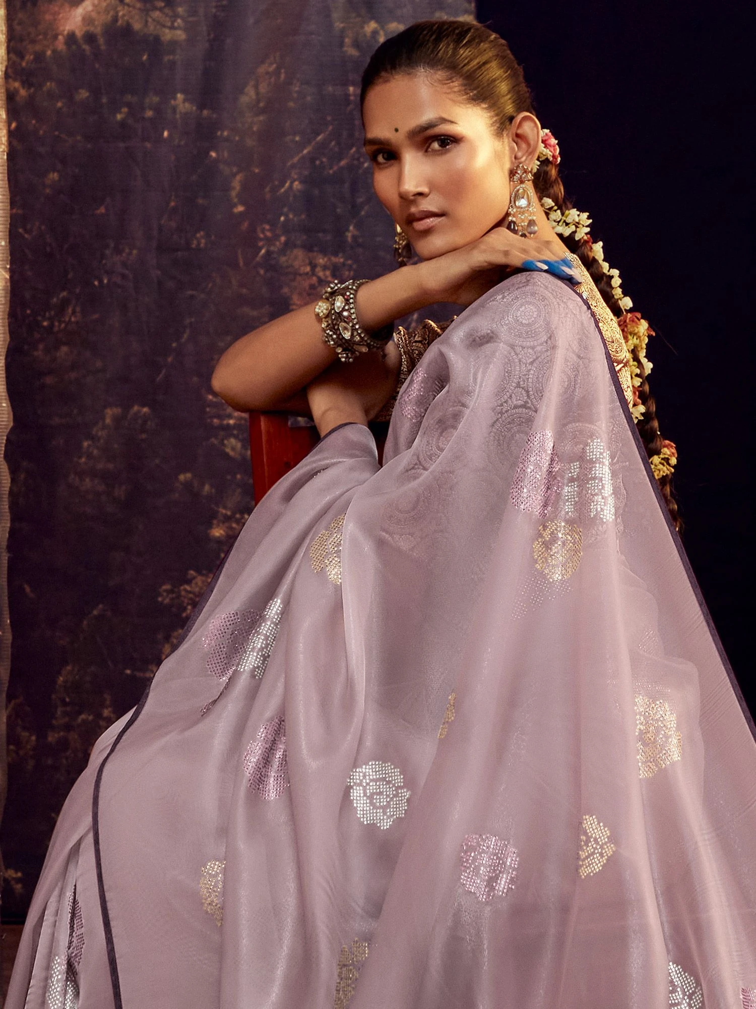 Give a glamorous glance wearing this lilac purple color saree designed in organza. Decorated using stone work, showcasing distinstive borders and pallu. Teamed with a matching golden color blouse in zari woven patterns. Note: The accessories featured are purely for fashion purposes. Due to photography reasons, some color variations may occur. The un-stitched blouse may be customized up to 42 inches.