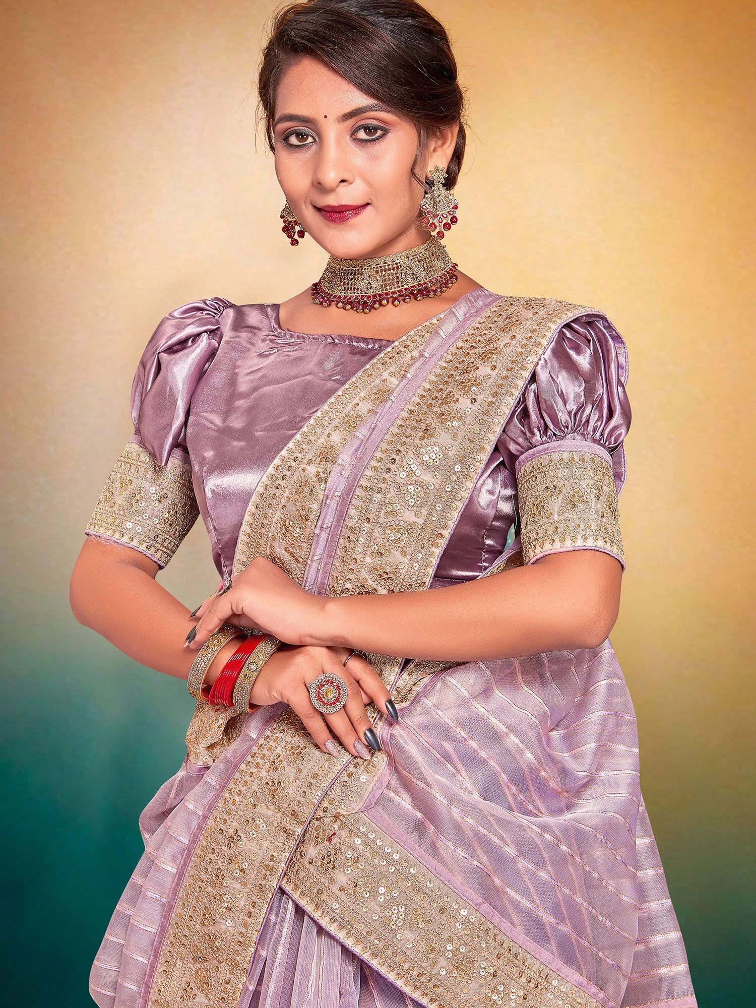 Slay with your classy taste as you wear this lilac purple color saree crafted in silk. Designed using sequins and zari work. Comes with a matching purple color blouse in silk. Note: The accessories featured are purely for fashion purposes. Due to photography reasons, some color variations may occur. The un-stitched blouse may be customized up to 42 inches.