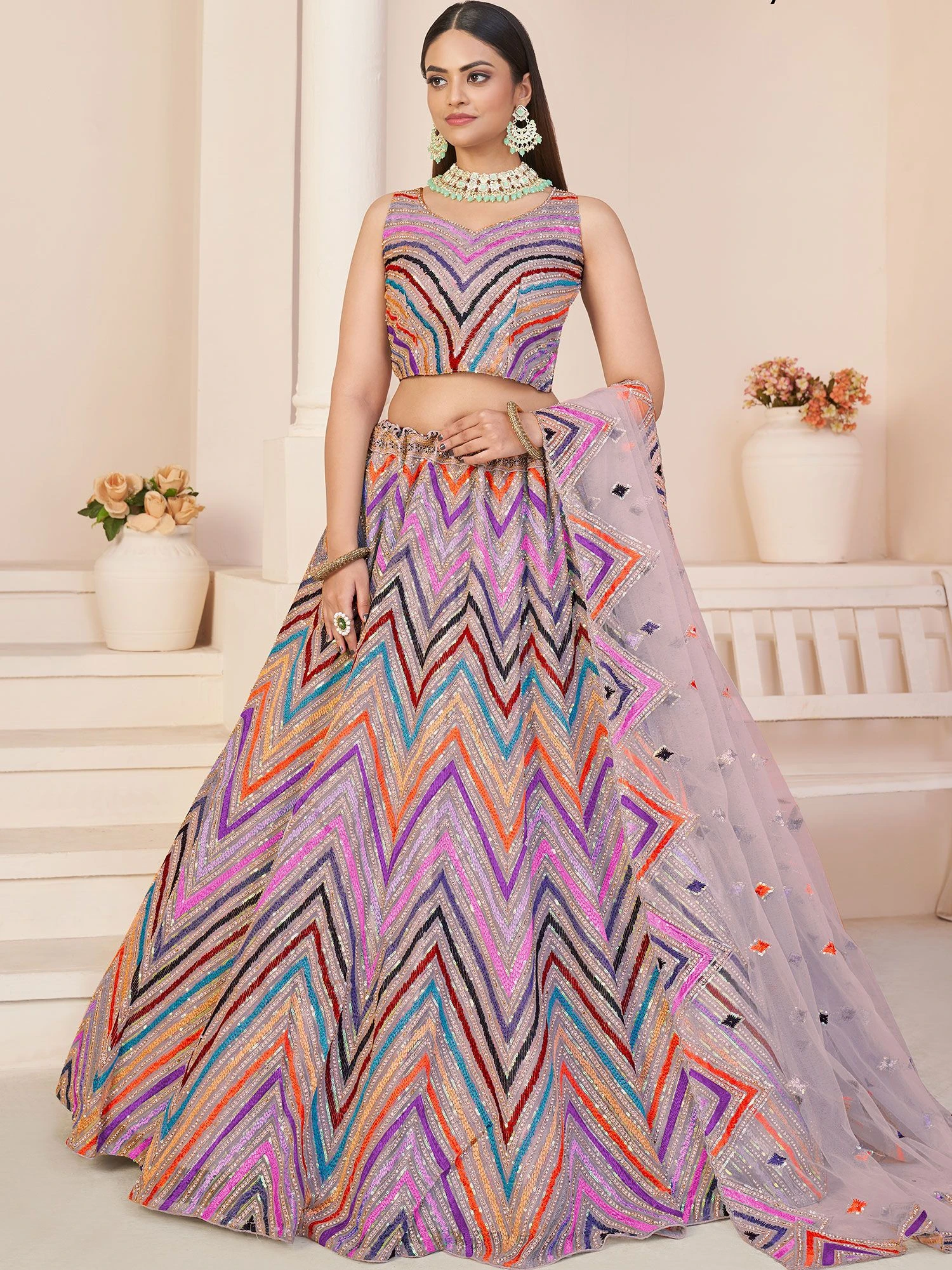 Add subtle glamour to the impressive persona in light purple color lehenga in net. Augmented with stone work and colorfull thread embroidery work. Paired with a matching color embroidered choli and a dupatta, both made in net. Note: The accessories featured are purely for fashion purposes. Due to photography reasons, some color variations may occur. The semi-stitched choli and lehenga waist may be customized up to 42 inches.