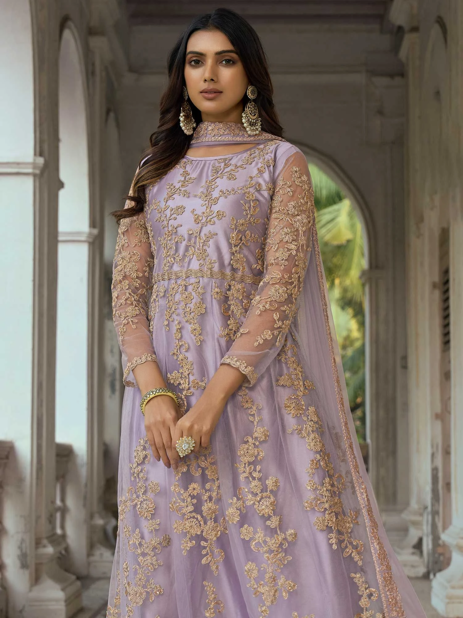 Grace the whole event adorning this light purple color anarkali kameez in net. Crafted using sequins, dori work embroidery all over. Assembled with a matching net dupatta and a matching bottom in satin. Note: Accessories shown are for styling purpose only. Slight color variation may occur due to photographic reasons. The semi-stitched kameez can be customised upto 42 inches.