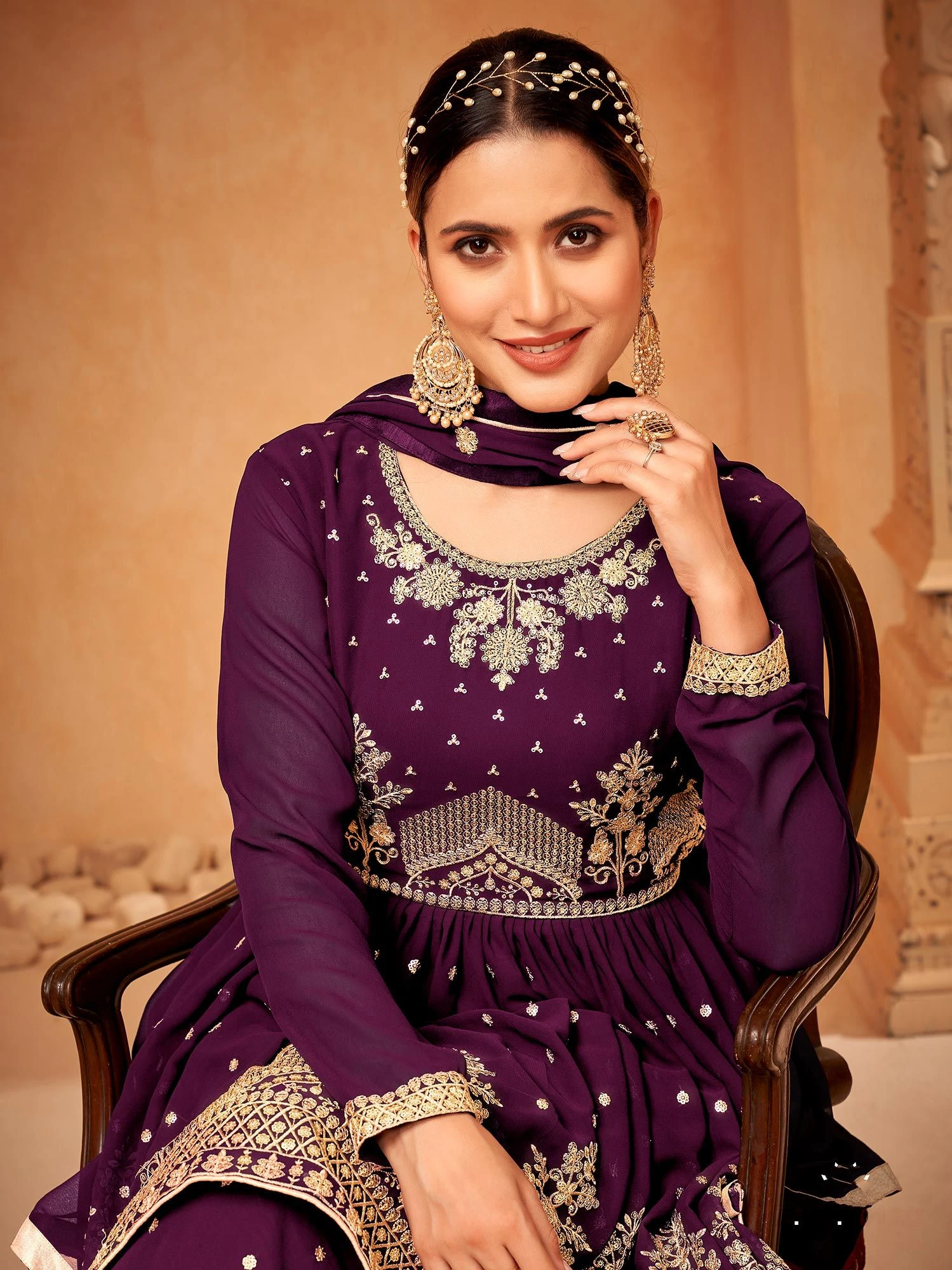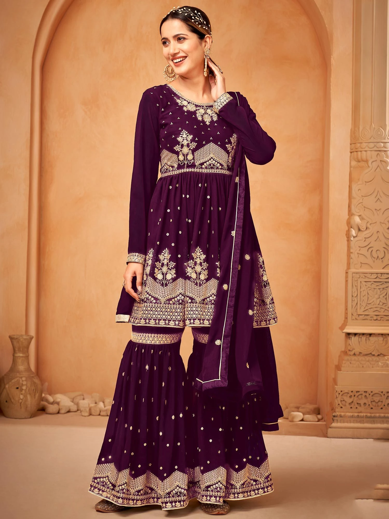 Dazzle the audience audience this eggplant purple color flared kameez in georgette. Augmented using sequins, zari work and thread embroidery all over. Teamed with a purple georgette dupatta and a matching sharara in georgette. Note: Accessories shown are for styling purpose only. Slight color variation may occur due to photographic reasons. The semi-stitched kameez can be customised upto 42 inches.