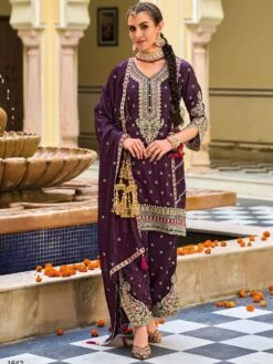 Cherish Your look with this wine purple color straight cut kameez in silk. Augmented using gota patti and thread work embroidery all over. Assigned with a silk dupatta and a palazzo style bottom, both made in purple. Note: Accessories shown are for styling purpose only. Slight color variation may occur due to photographic reasons. The semi-stitched kameez can be customised upto 42 inches.