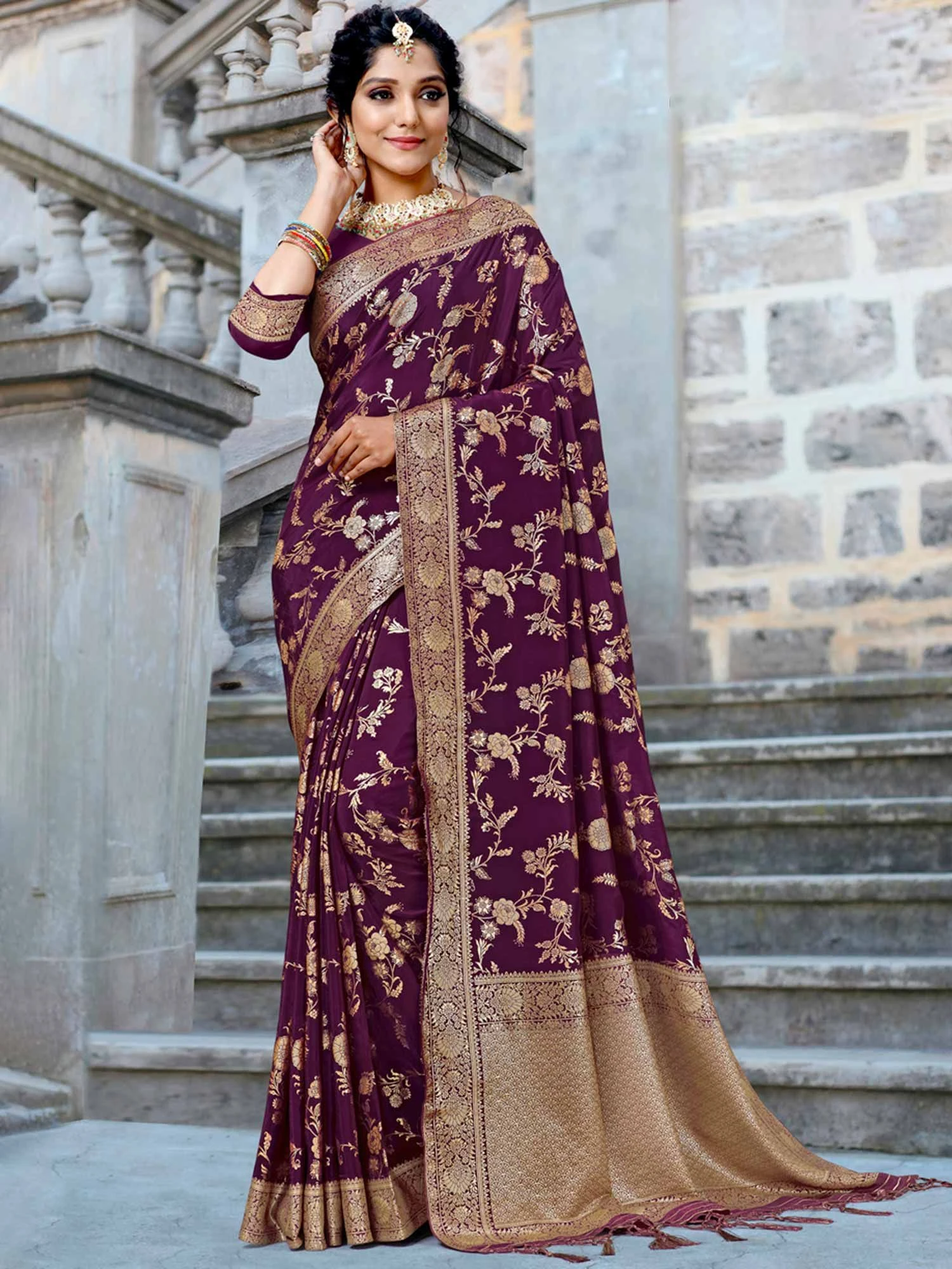 Mark your appearance with this royal purple color saree crafted in art silk. Enhanced using zari woven patterns, showcasing distinctive borders and pallu. Available with a matching purple color blouse in dupion silk. Note: The accessories featured are purely for fashion purposes. Due to photography reasons, some color variations may occur. The un-stitched blouse may be customized up to 42 inches.
