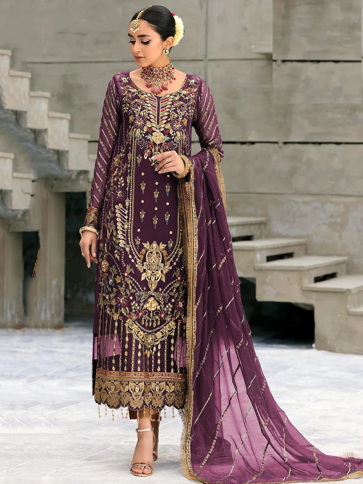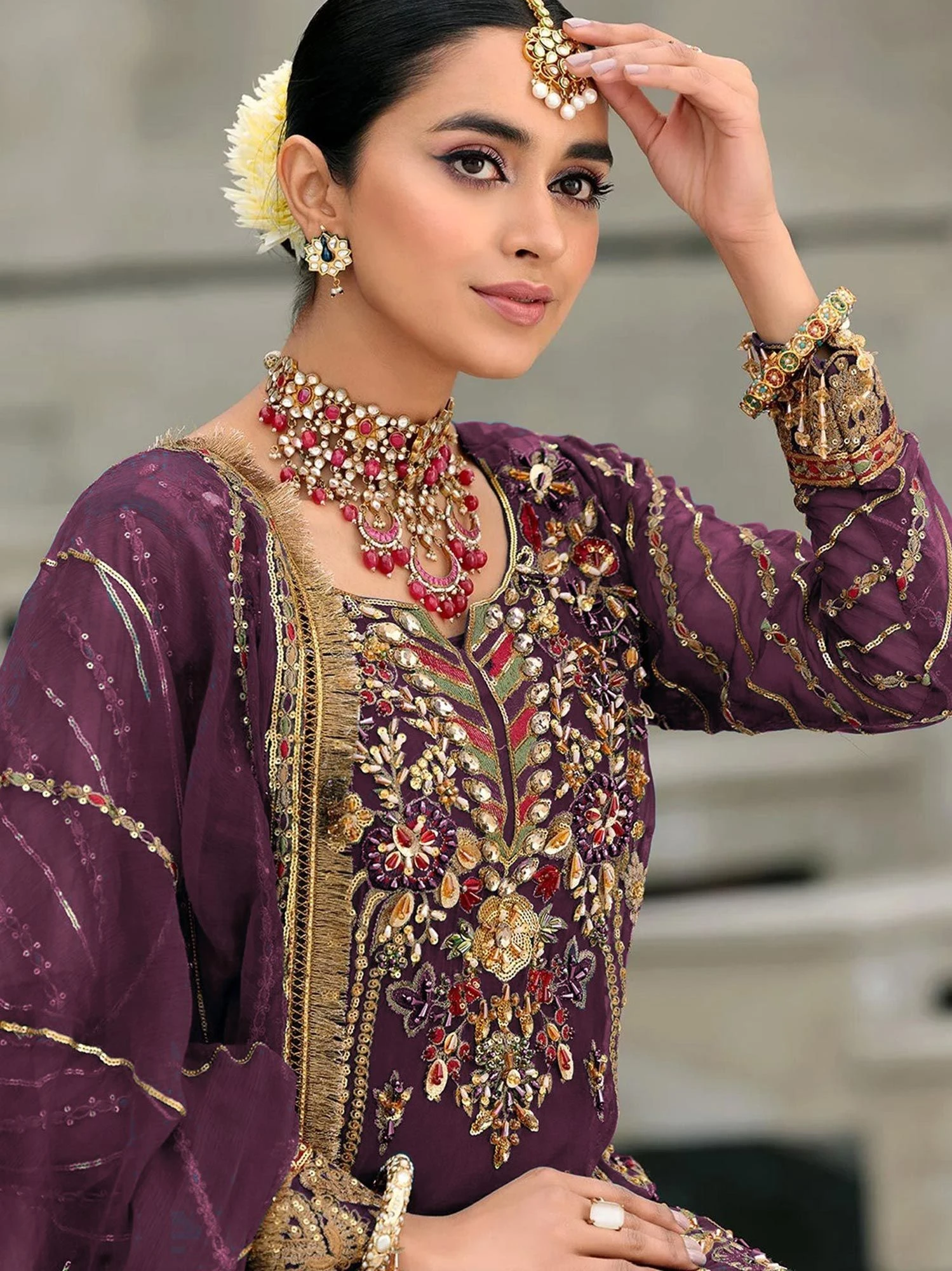 Evoke the fashionista in you adorning this grape purple color straight cut kameez in georgette. Enhanced using sequins, stones, zari and thread work embroidery all over. Assembled with a purple chiffon dupatta with embroidery and matching pants in shantoon. Note: Accessories shown are for styling purpose only. Slight color variation may occur due to photographic reasons. The semi-stitched kameez can be customised upto 42 inches.
