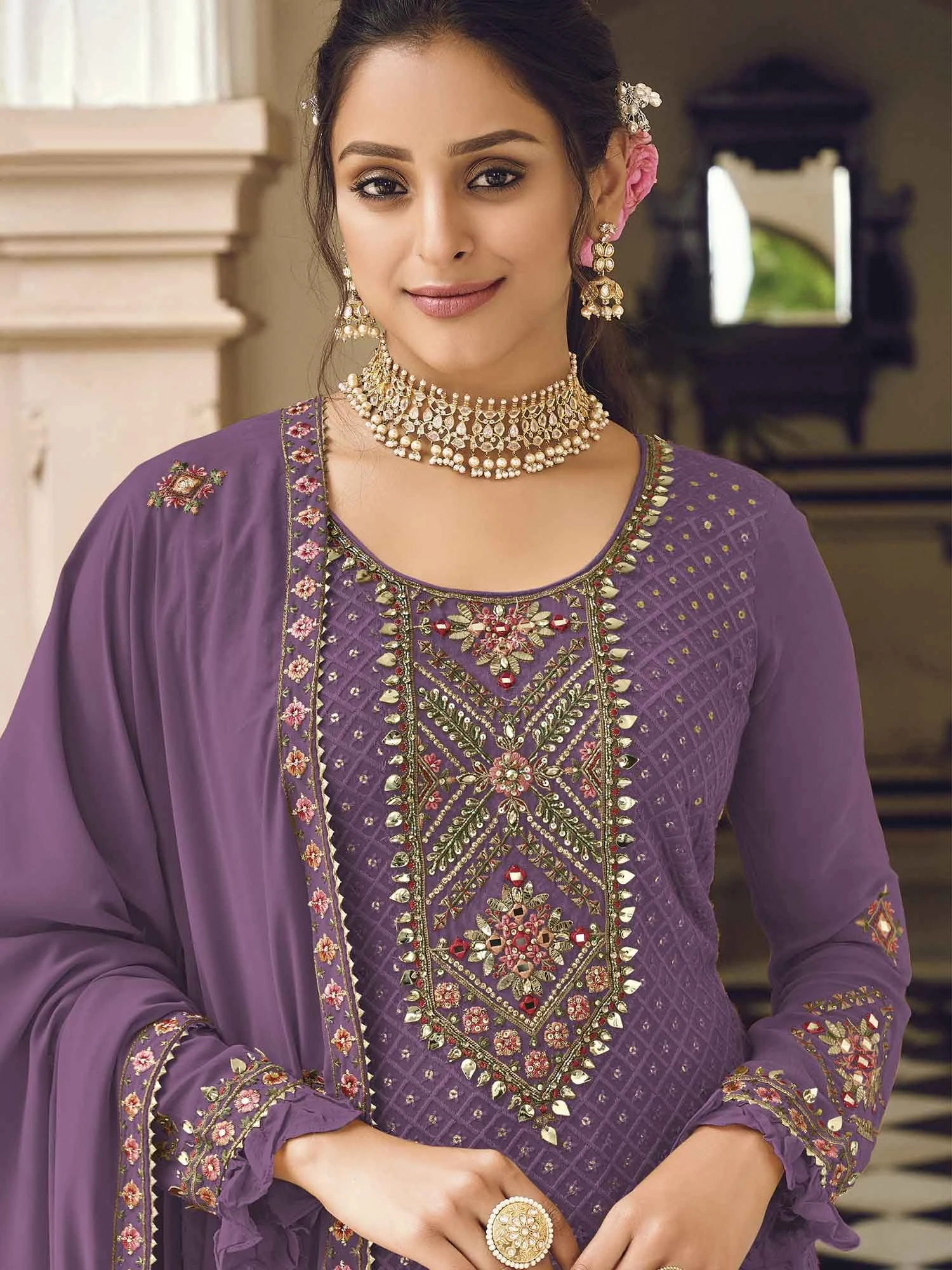 Be the cente of attraction sporting this purple color straight cut kameez in georgette. Augmented using sequins, stones and thread embroidery all over. Assembled with a matching georgette dupatta and a matching shantoon pants. Note: Accessories shown are for styling purpose only. Slight color variation may occur due to photographic reasons. The semi-stitched kameez can be customised upto 42 inches.