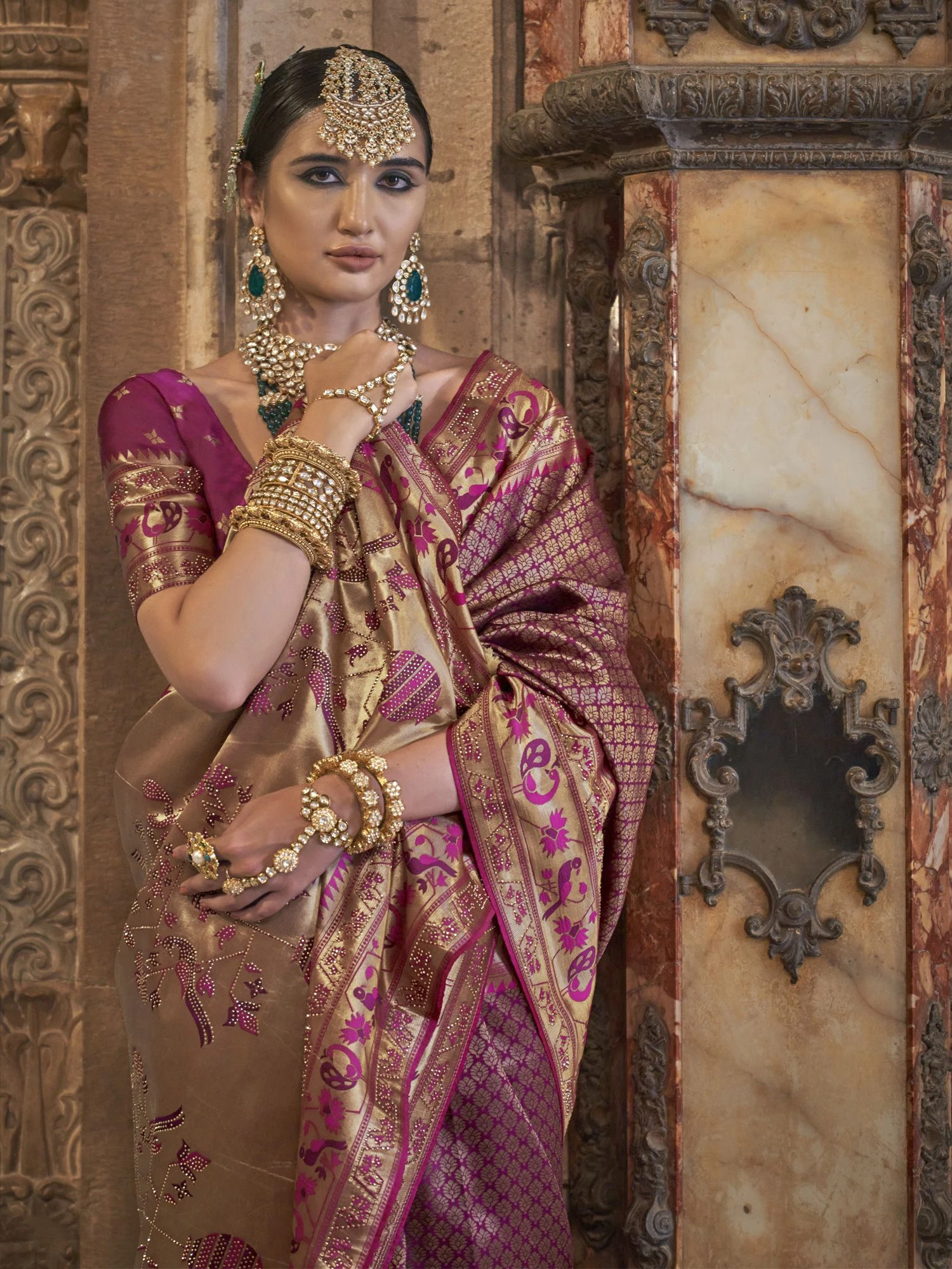 Create elegance in every drape wearing this grape purple color saree crafted in banarasi silk. Enhanced using stone work with zari weaving, showcasing distinstive borders and pallu. Comes with a matching purple color blouse in banarasi silk. Note: The accessories featured are purely for fashion purposes. Due to photography reasons, some color variations may occur. The un-stitched blouse may be customized up to 42 inches.