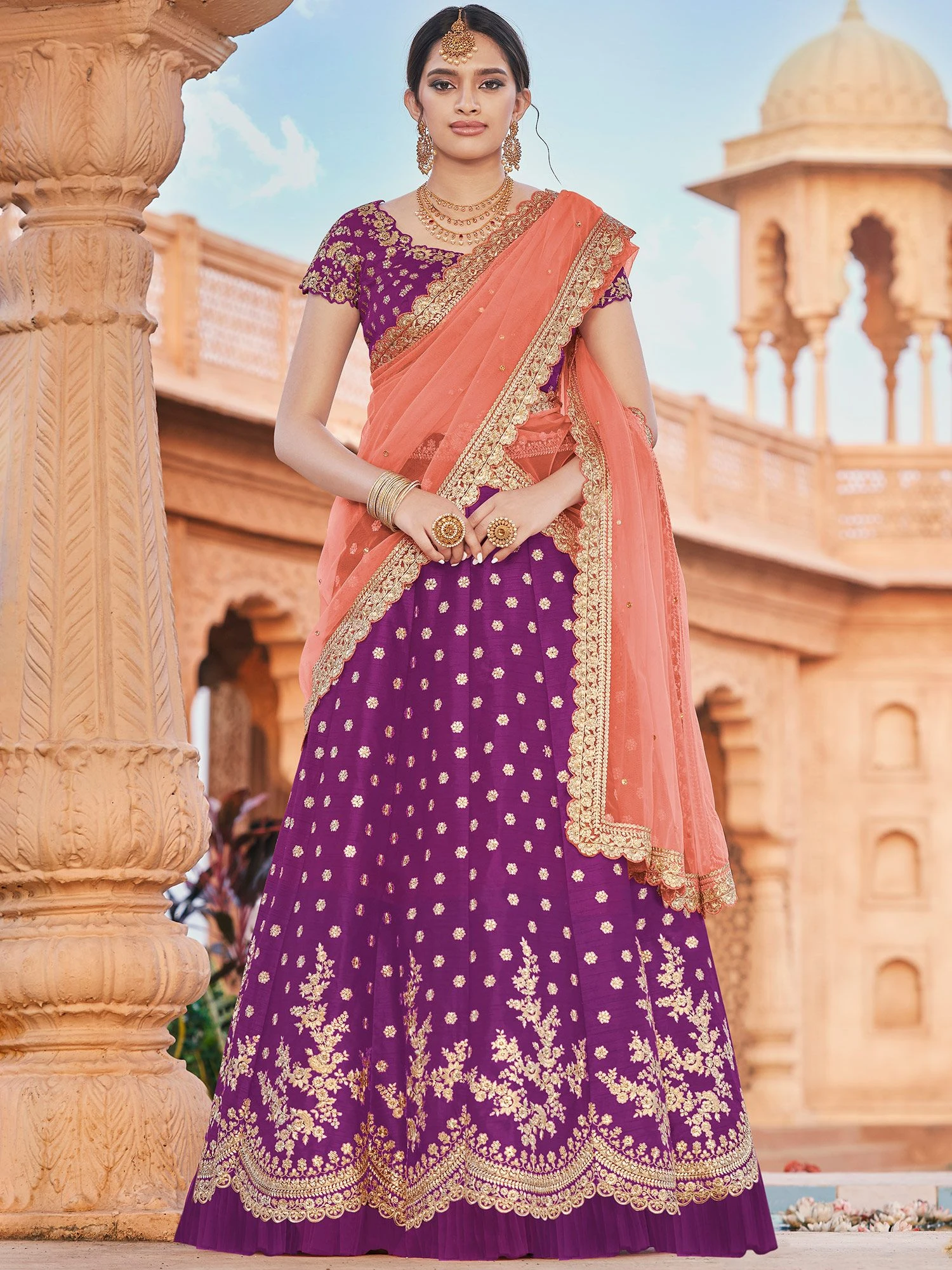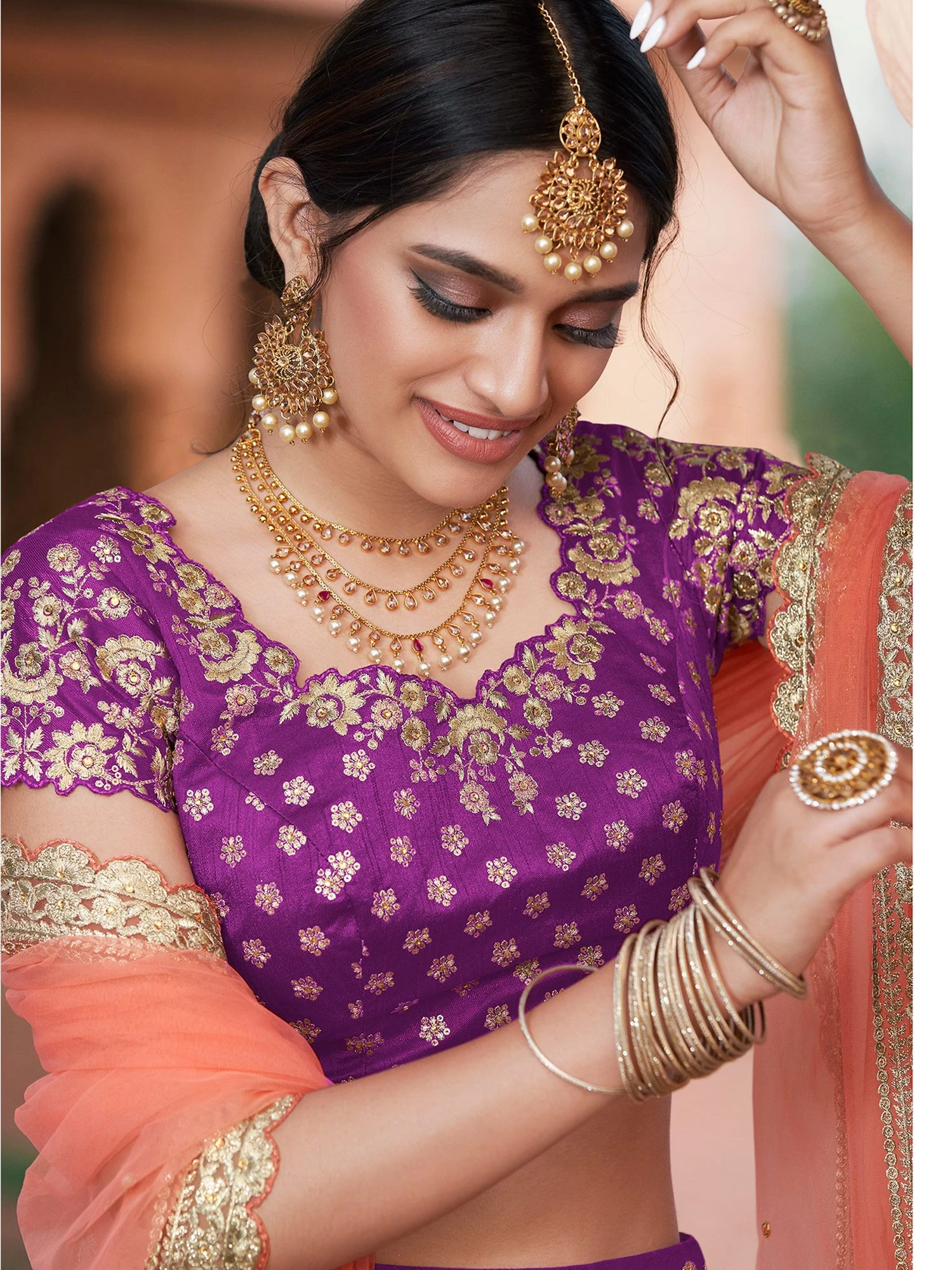Grace the occasion wearing this heart purple colored festive lengha in handloom silk. Furnished with zari, sequins and stone embroidery all over. Available along with a purple color art silk choli and a peach color net dupatta, both enhanced with similar embroidery. The semi stitched choli can be customized up to 42 inches. Note: The accessories featured are purely for fashion purposes. Due to photography reasons, some color variations may occur. The semi-stitched choli and lehenga waist may be customized up to 42 inches.