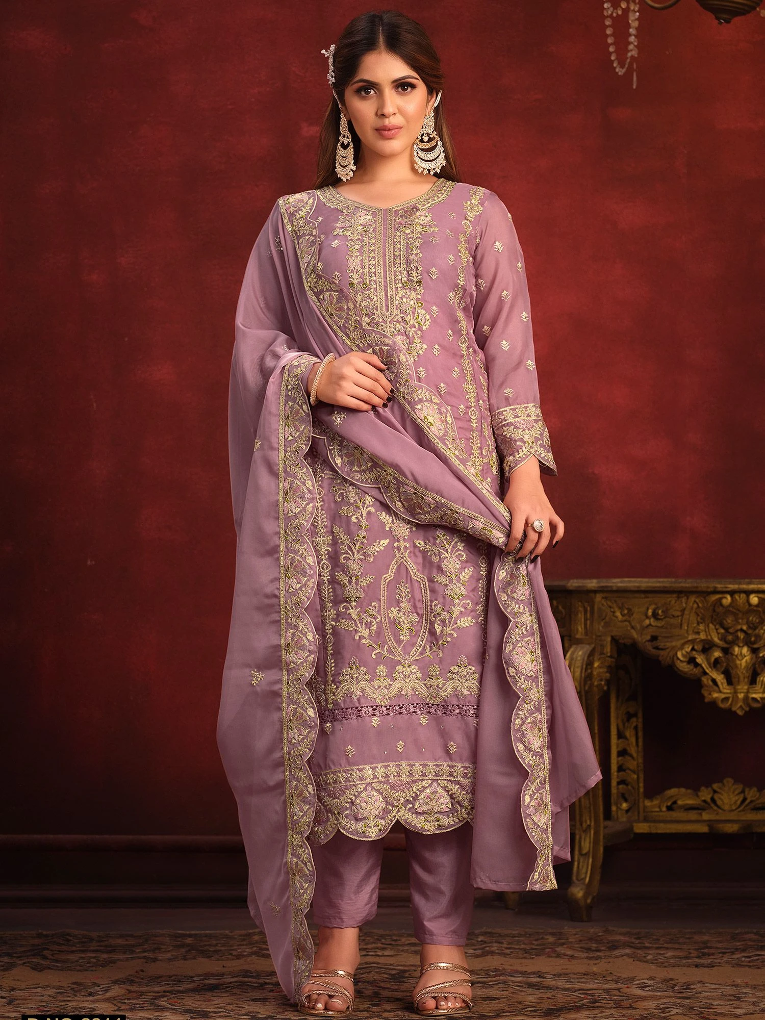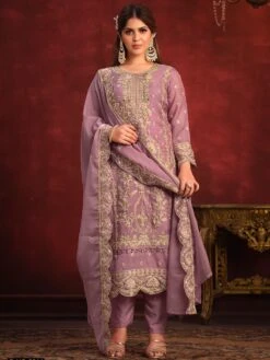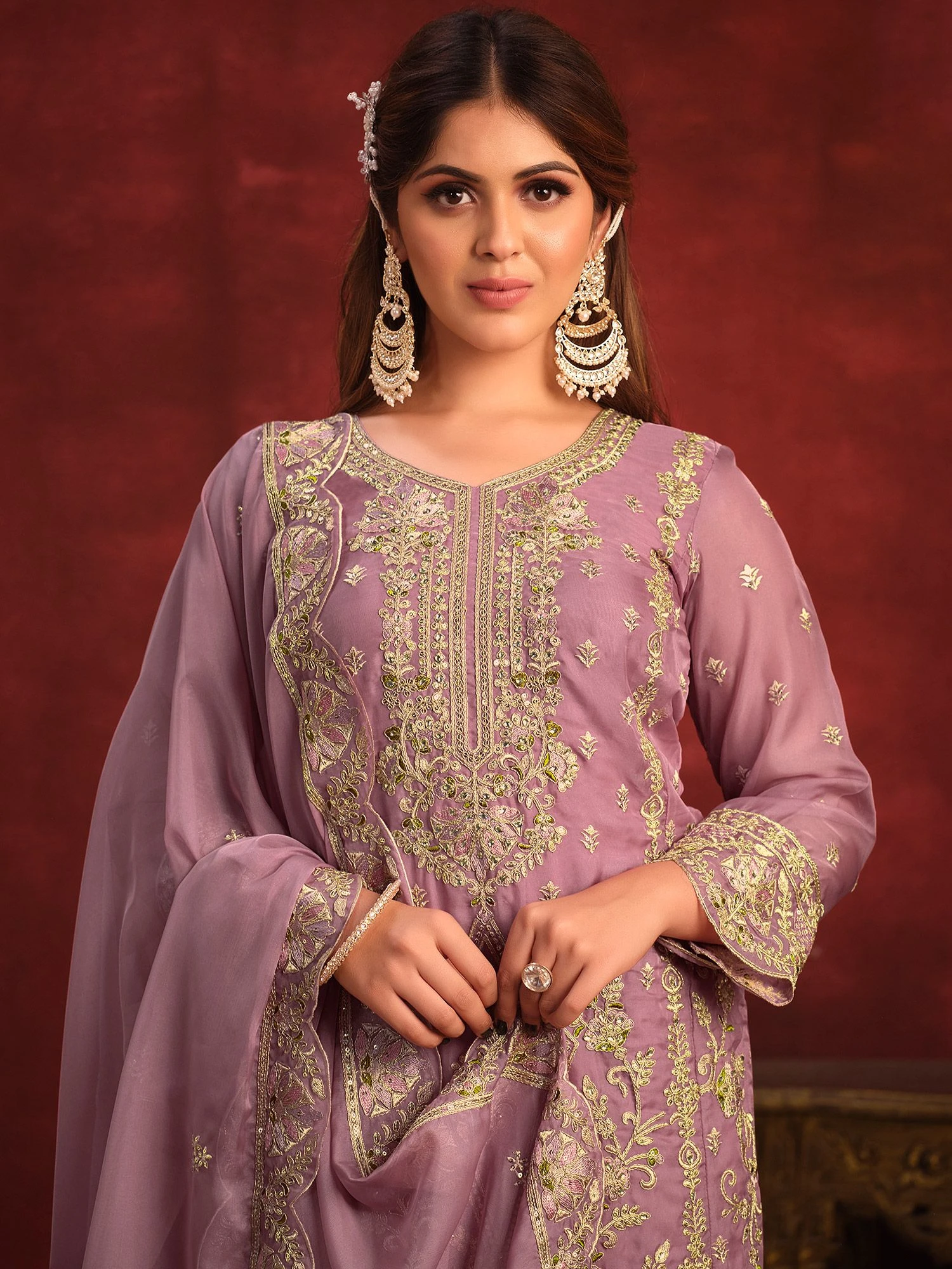 Exude major dreamy vibes with this dusky purple color straight cut kameez in organza. Designed using stones, mirrors, sequins and zari work embroidery all over. Paired with a organza dupatta and a pant style bottom in shantoon, both made in purple color. Note: Accessories shown are for styling purpose only. Slight color variation may occur due to photographic reasons. The semi-stitched kameez can be customised upto 42 inches.