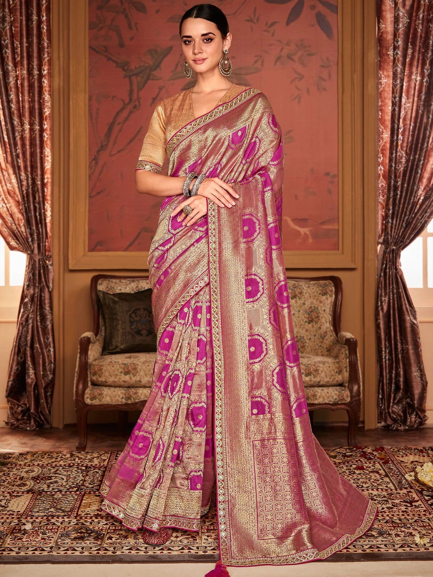 Radiate ethereal vibes wearing this madri gras purple color saree crafted in silk. Designed using zari woven patterns, showcasing distinstive borders and pallu. Comes with a matching brown color embroidered blouse in silk. Note: The accessories featured are purely for fashion purposes. Due to photography reasons, some color variations may occur. The un-stitched blouse may be customized up to 42 inches.