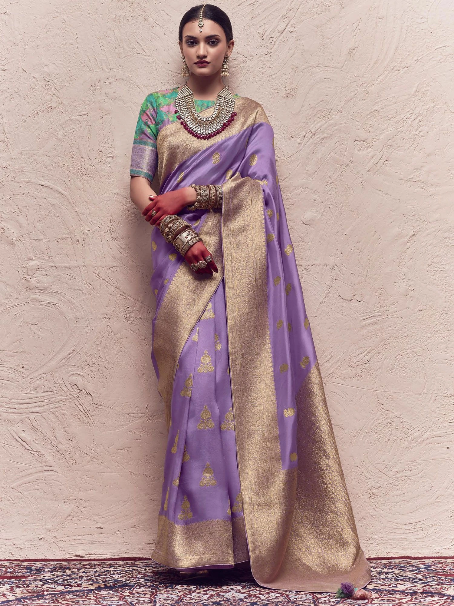 Get the praiseworthy look wearing this lavender purple color saree crafted in silk. Designed using zari woven patterns, showcasing distinstive borders and pallu. Comes with a mutlicolor zari woven blouse made in silk. Note: The accessories featured are purely for fashion purposes. Due to photography reasons, some color variations may occur. The un-stitched blouse may be customized up to 42 inches.