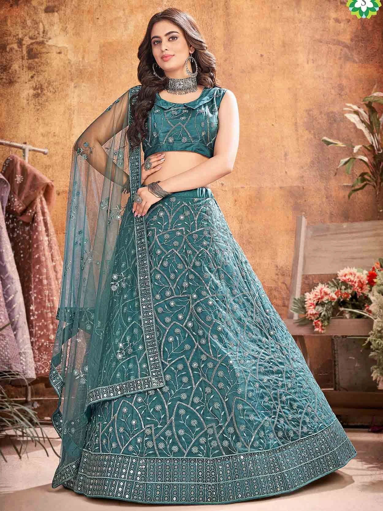 Women’s Pretty Circular Lehenga Style in Rama Green Colour Net Fabric This attire is nicely made with Zari,Embroidery,Sequin work.