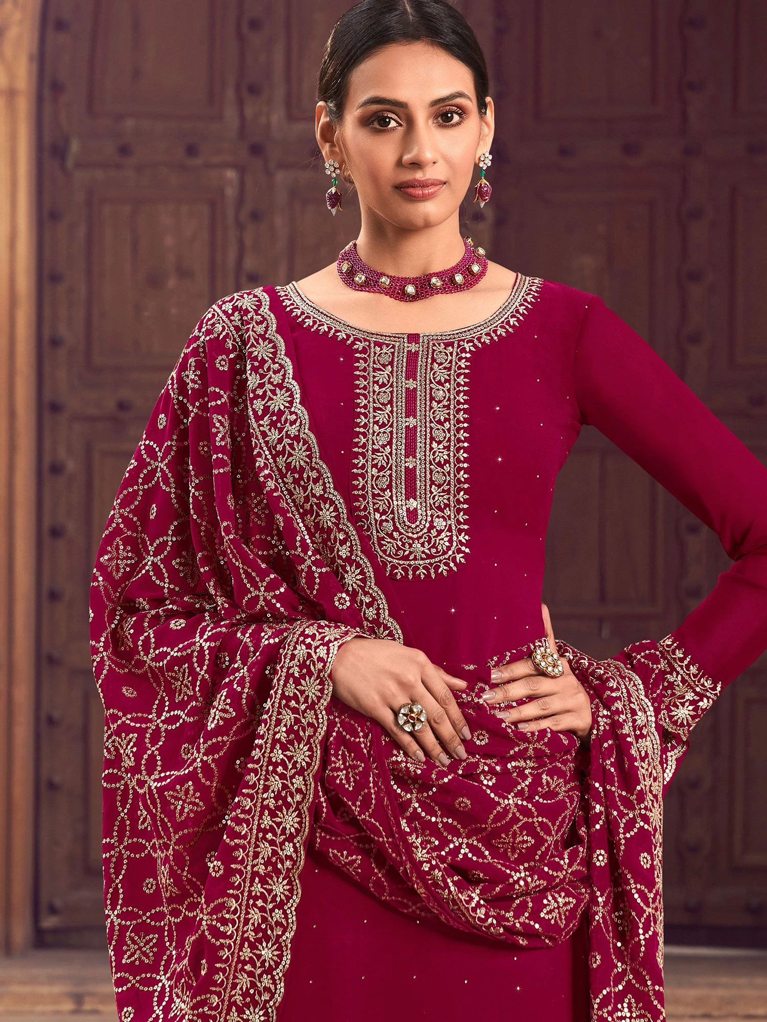 Exude major dreamy vibes with this pink color straight cut kameez in georgette. Designed using sequins and thread work embroidery all over. Paired with a georgette embroidered dupatta and a palazzo style bottom, both made in pink color. Note: Accessories shown are for styling purpose only. Slight color variation may occur due to photographic reasons. The semi-stitched kameez can be customised upto 42 inches.