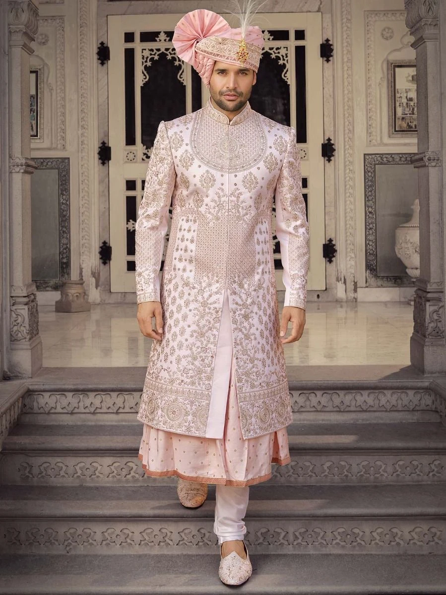 Add style to your D-day wearing this white color readymade sherwani with matching peach color anarkali kurta made in art silk. Augmented using extensive thread, zari embroidery with stones, sequins embellishment work. Furnished using mandarin collar, front opening and full sleeves. Paired with white color churidaar in art silk. Please note that some color variations may occur owing to photography causes. Up to 1 inch of measurement fluctuation is possible.