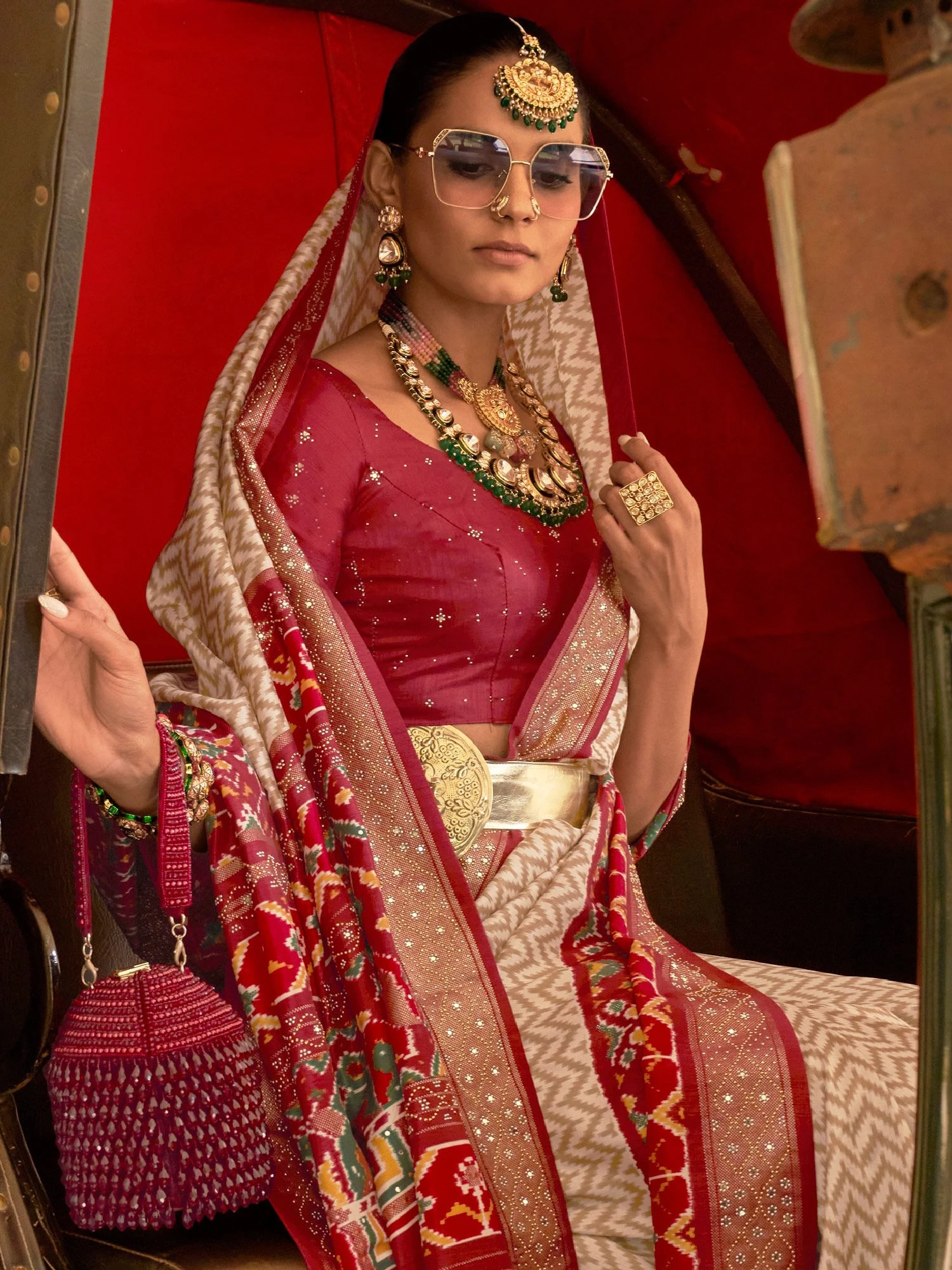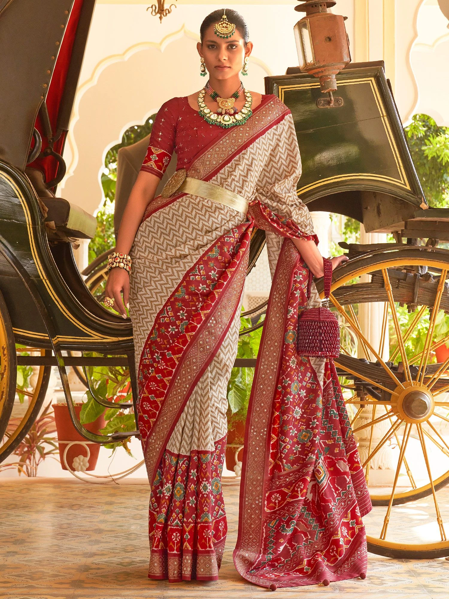 Grace up your look wearing this red and white color saree crafted in patola silk. Designed using patola prints, stones, zari woven distinstive borders and pallu. Comes with a matching deep red color blouse in silk. Note: The accessories featured are purely for fashion purposes. Due to photography reasons, some color variations may occur. The un-stitched blouse may be customized up to 42 inches.