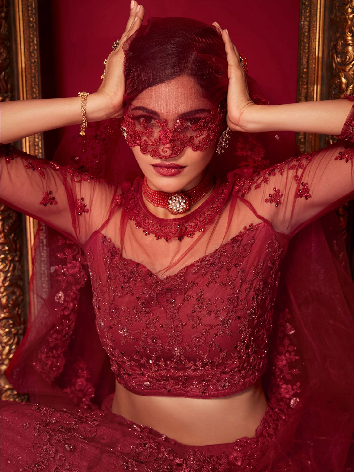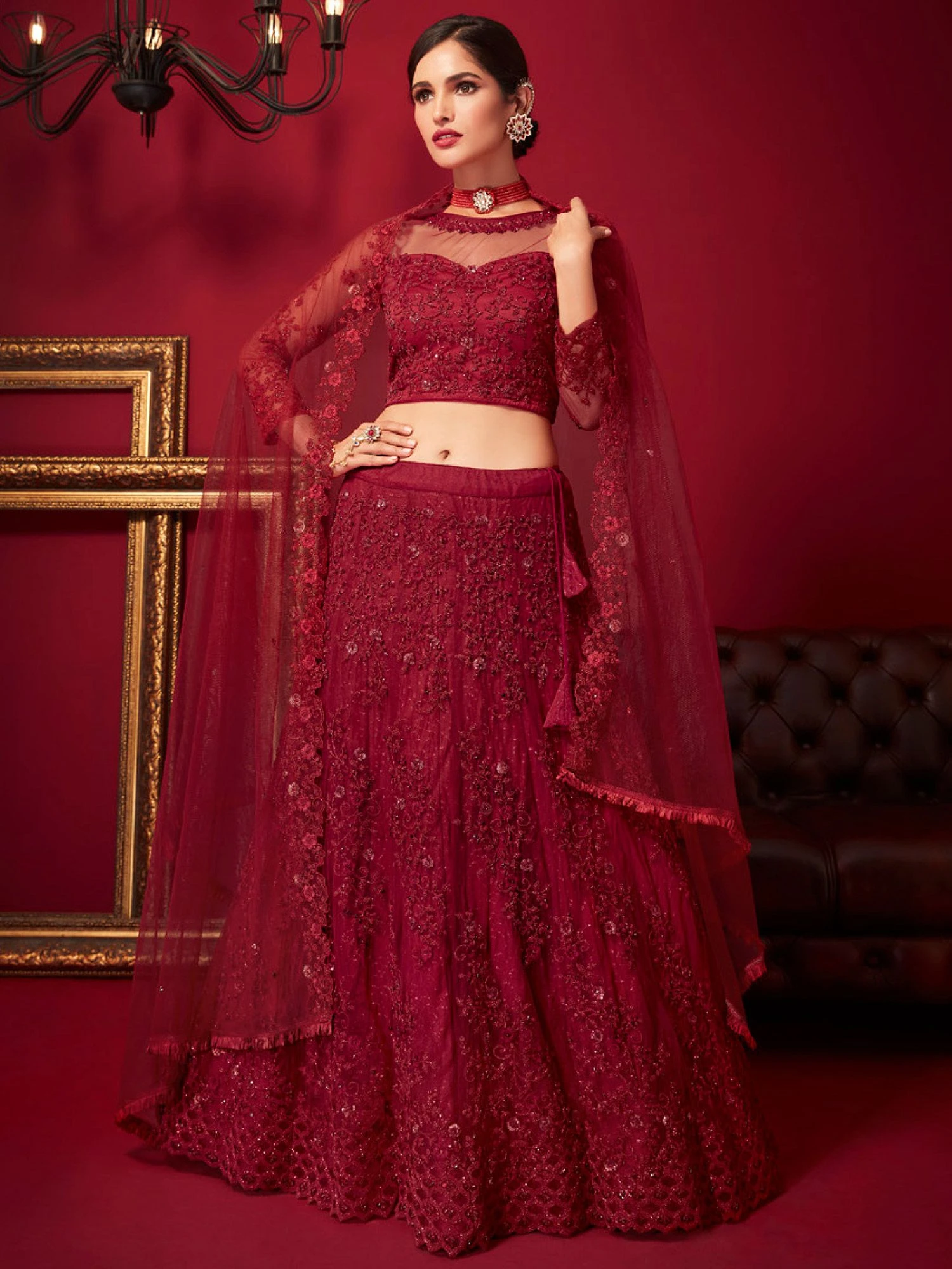 Spread your charm everywhere wearing this carmine red color designer lehenga in net. Decorated with sequins, stones zari with thread heavy floral embroidered work. Paired with a matching red color embroidered choli in net and red color dupatta, made in net. Note: The accessories featured are purely for fashion purposes. Due to photography reasons, some color variations may occur. The semi-stitched choli and lehenga waist may be customized up to 42 inches.