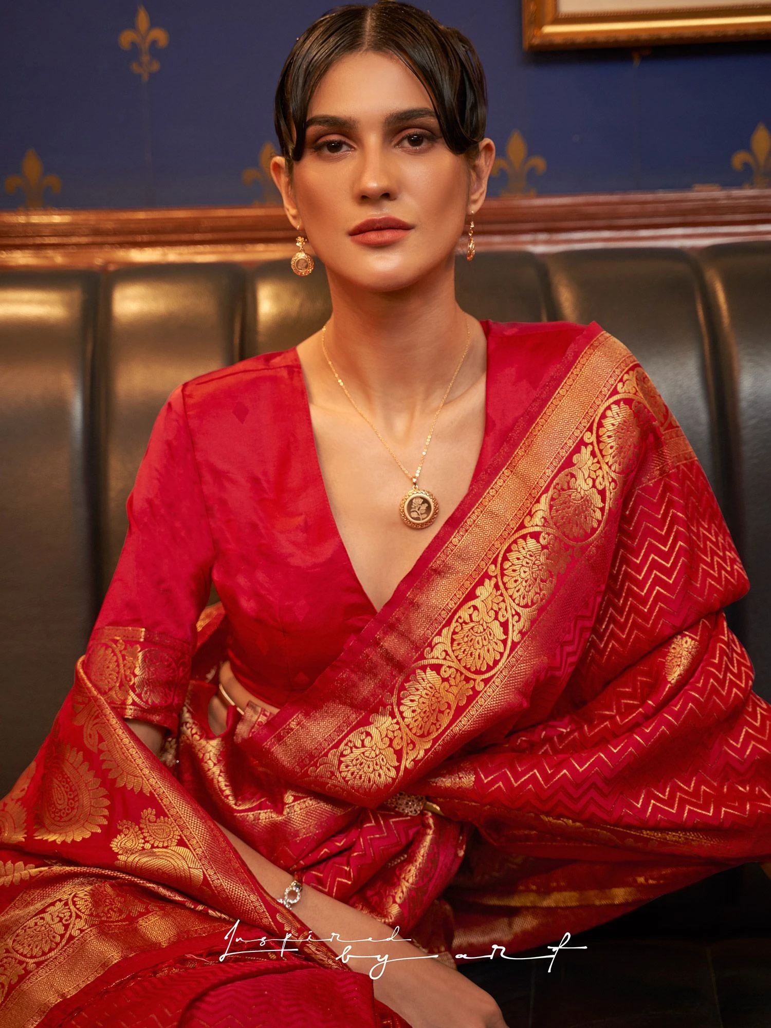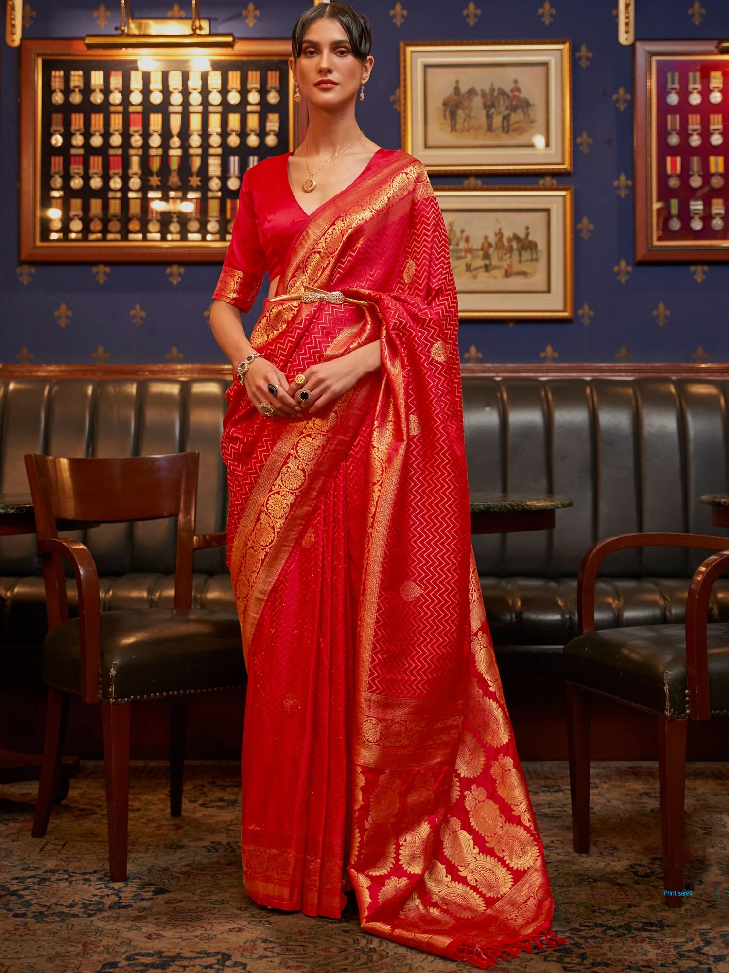 Show your feminine side to the world wearing this pure red color saree crafted in art silk. Designed using zari woven patterns, showcasing distinstive borders and pallu. Assembled with a matching color blouse in art silk. Note: The accessories featured are purely for fashion purposes. Due to photography reasons, some color variations may occur. The un-stitched blouse may be customized up to 42 inches.