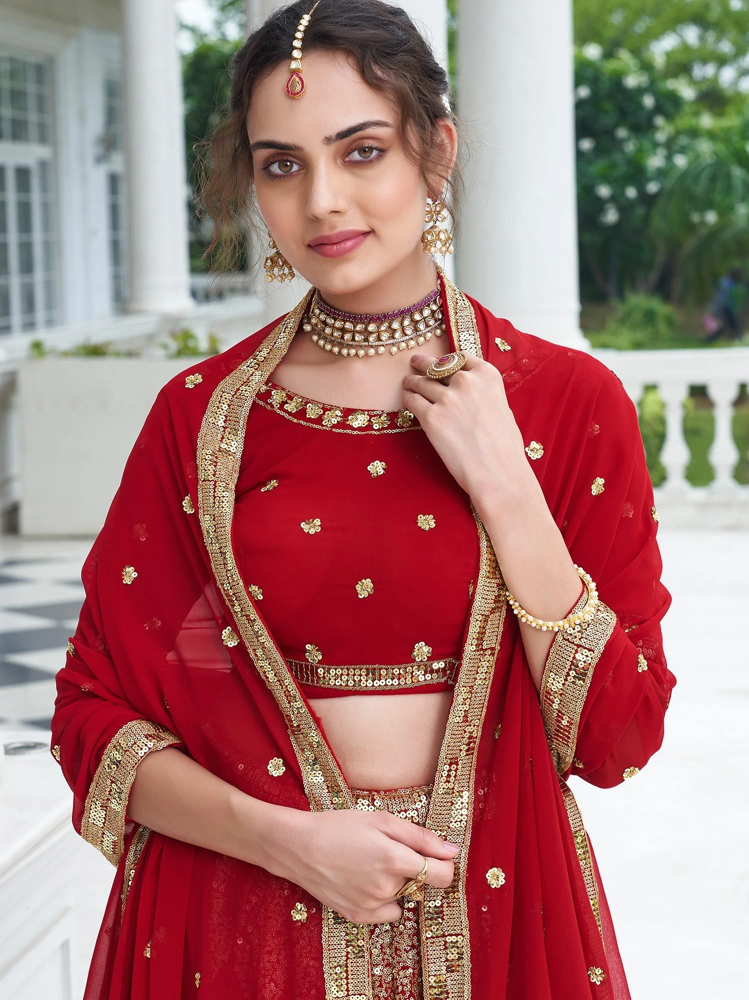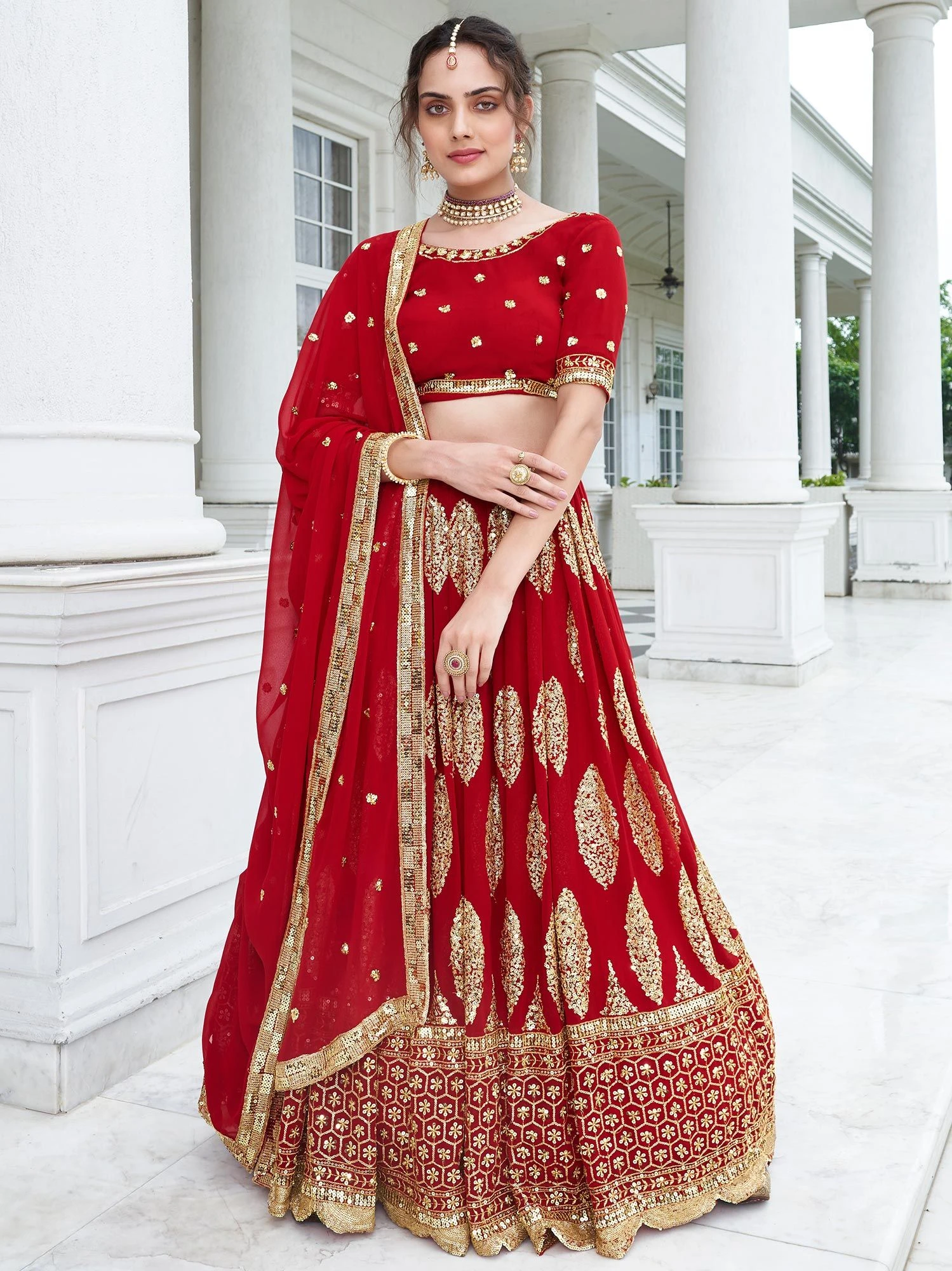 Spread the dazzling sparkles wearing this scarlet red color lehenga in georgette. Decorated with sequins and zari embroidered work. Assembled with a matching red color embroidered choli and a red sequined dupatta, both made in georgette. Note: The accessories featured are purely for fashion purposes. Due to photography reasons, some color variations may occur. The semi-stitched choli and lehenga waist may be customized up to 42 inches.