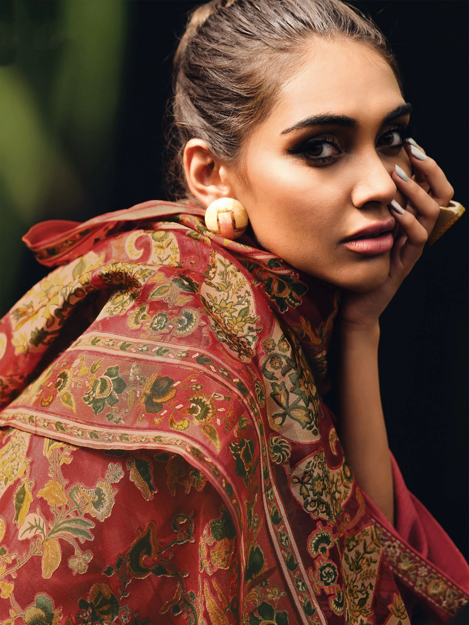 Get a squeaky clean ethnic look adorning this blush red color straight cut kameez in muslin. Enhanced using printed with floral thread work embroidery all over. Assigned with a printed dupatta made in organza brasso and a palazzo style bottom in cotton silk, both made in red color. Note: Accessories shown are for styling purpose only. Slight color variation may occur due to photographic reasons. The semi-stitched kameez can be customised upto 42 inches.