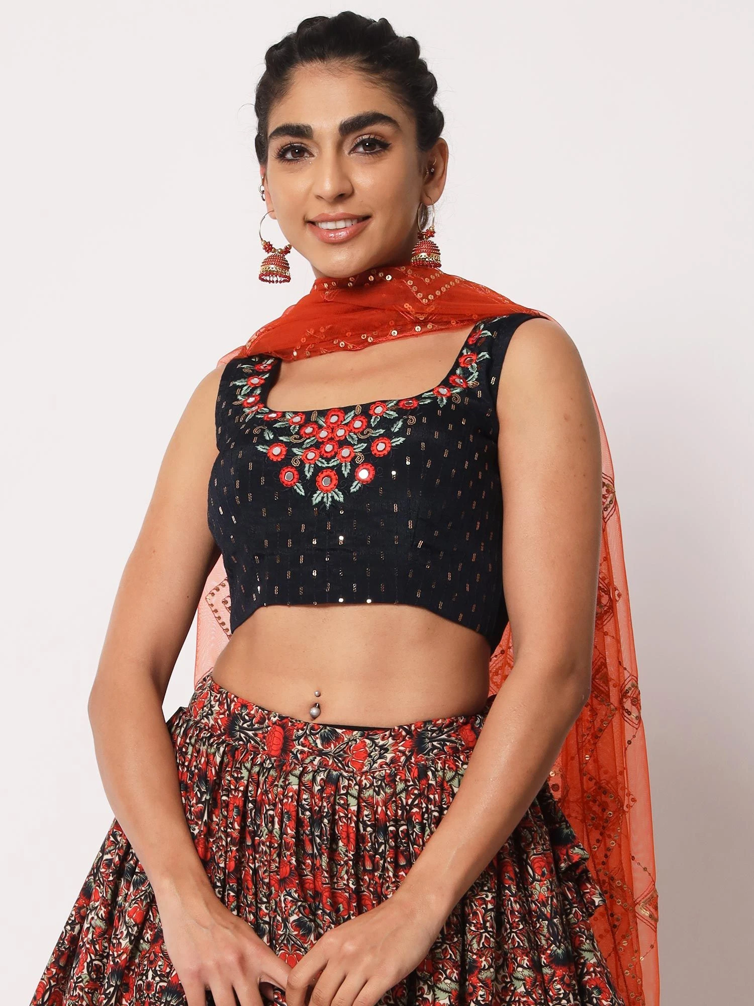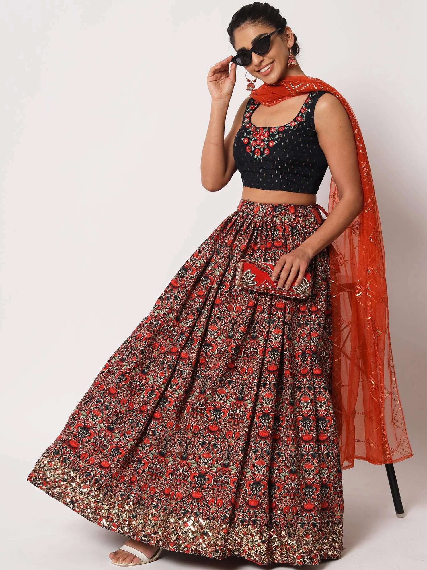 Be the epitome of grace wearing this red color lehenga in art silk. Enhanced with floral prints, sequins and thread embroidered work. Teamed with a matching blue color embroidered georgette choli and red dupatta made in net. Note: The accessories featured are purely for fashion purposes. Due to photography reasons, some color variations may occur. The semi-stitched choli and lehenga waist may be customized up to 42 inches.