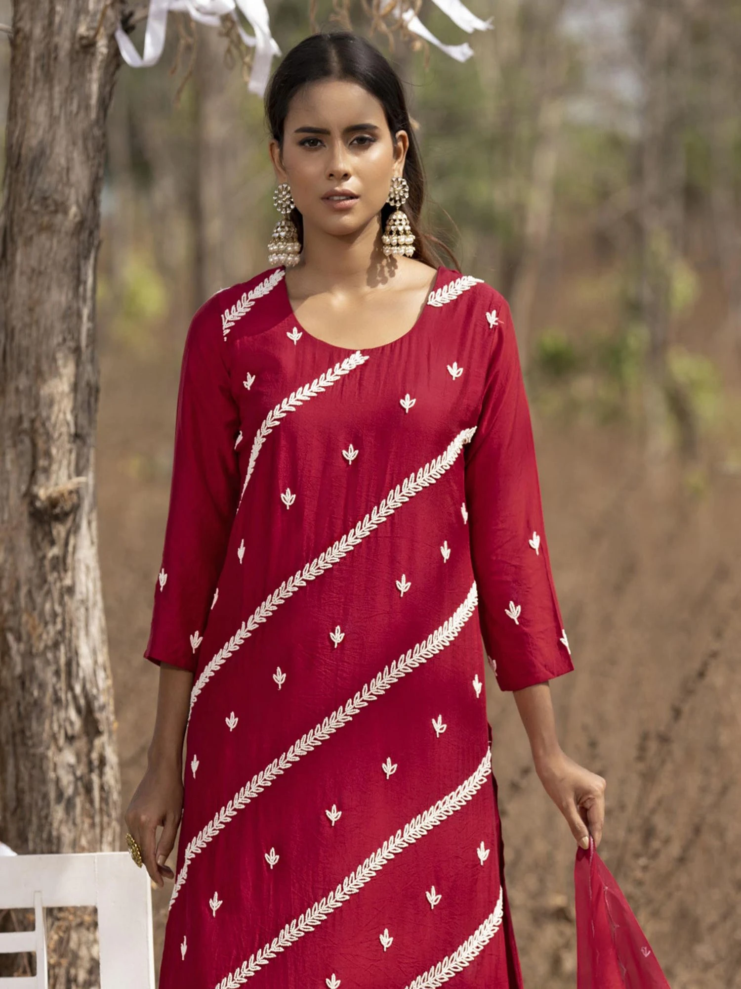 Enhance yourself with this cardinal red color straight cut kameez in cotton. Crafted using sequins and thread work embroidery all over. Teamed with a cotton dupatta and a pant style bottom, both made in red color. Note: Accessories shown are for styling purpose only. Slight color variation may occur due to photographic reasons. The semi-stitched kameez can be customised upto 42 inches.