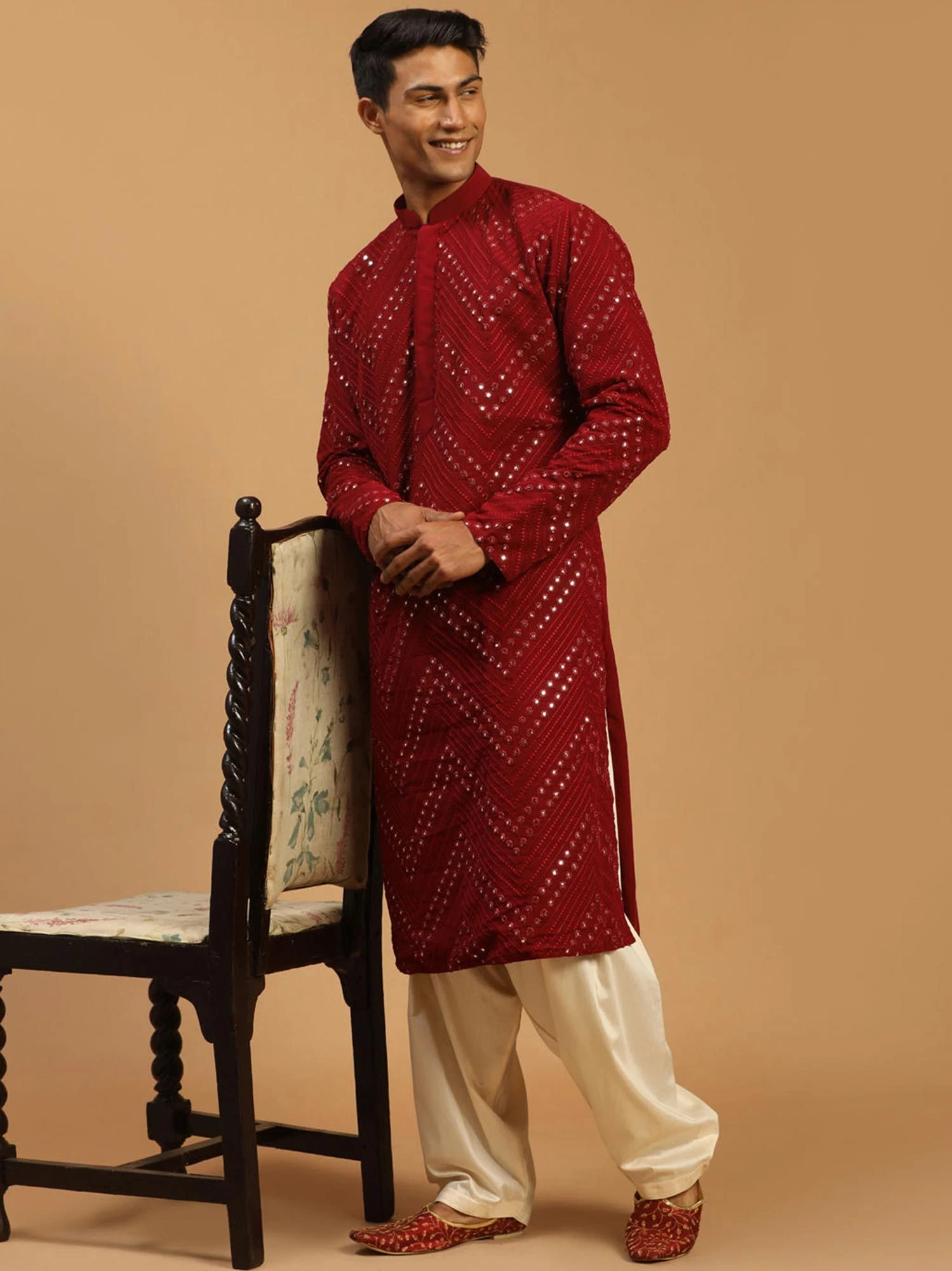 Be the best dressed men adorning this deep red color kurta made in georgette. Elevated with mirror embroidered details all oevr. Assembled with a off-white color pathani salwar pants in art silk. Note: Some color variations may occur owing to photography causes. Up to 1 inch of measurement fluctuation is possible.