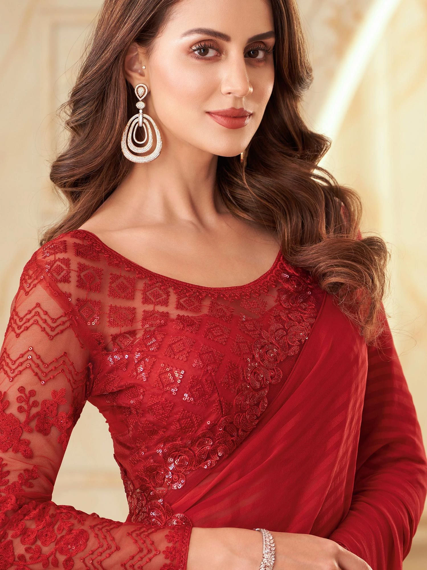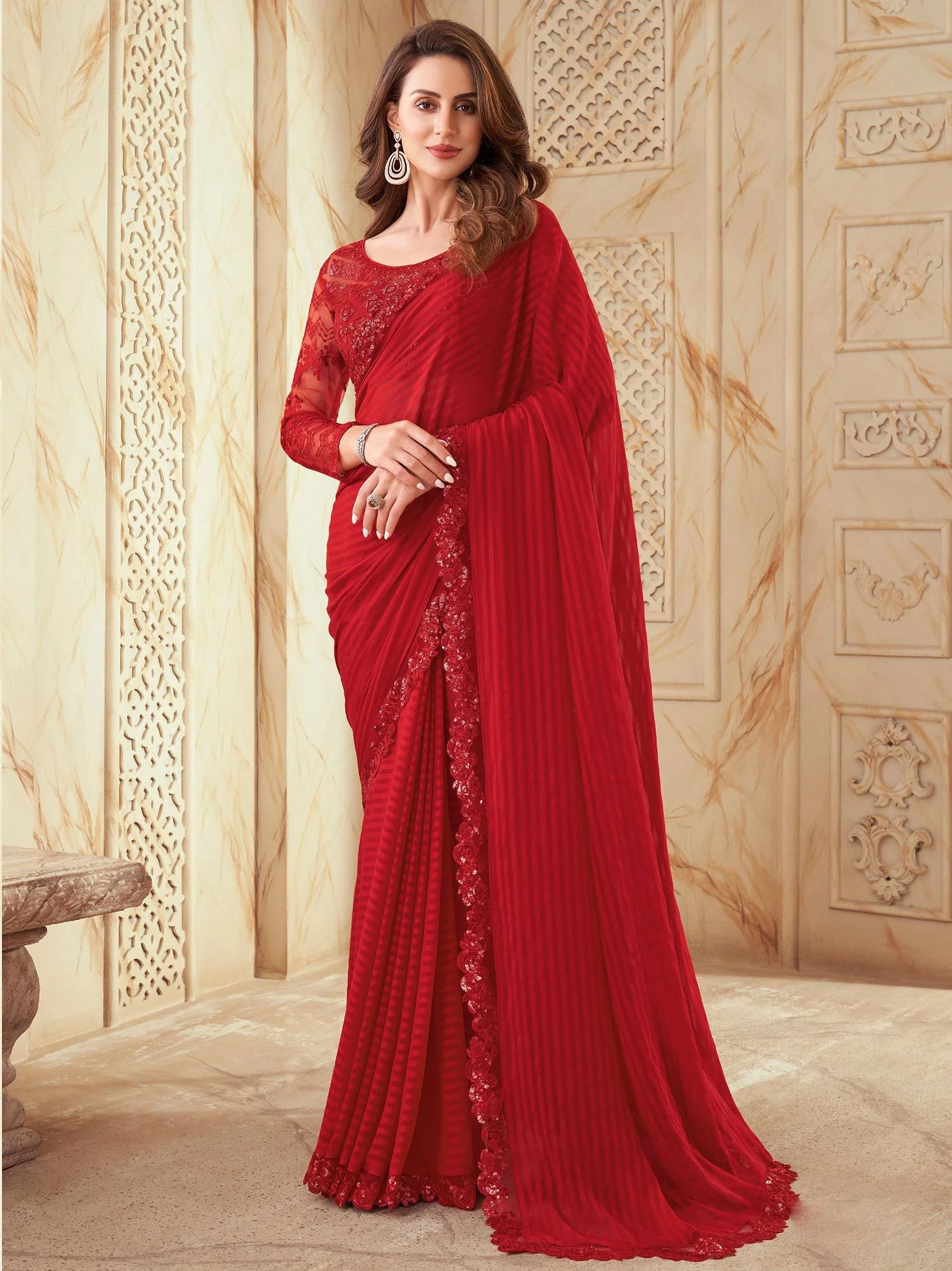 Overwhelm the audience as you wear this cherry red color saree crafted in silk. Augmented using sequins embroidered patterns creating distinstive borders. Comes with a matching sequins embroidered silk blouse in red color. Note: The accessories featured are purely for fashion purposes. Due to photography reasons, some color variations may occur. The un-stitched blouse may be customized up to 42 inches.
